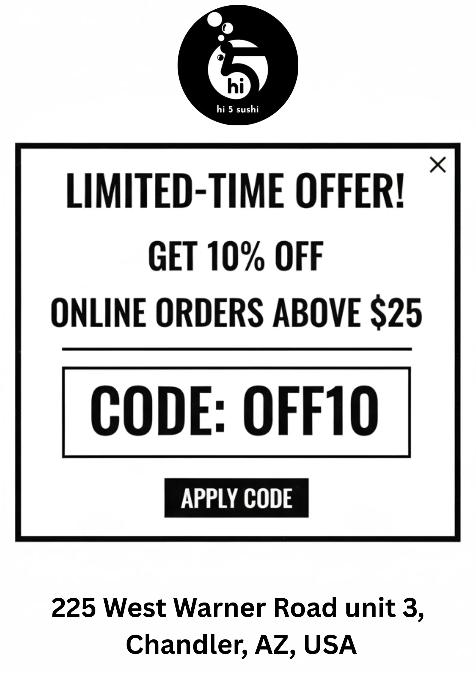Welcome to Hi 5 Sushi, your destination for exceptional sushi at 225 West Warner Road, Unit 3, Chandler, AZ, USA. Our kitchen is dedicated to the art of sushi, crafting each roll with precision and fresh, high-quality ingredients. From traditional nigiri to innovative specialty rolls, each bite offers a delightful burst of flavor. Join us at Hi 5 Sushi and elevate your dining experience with our exquisite Japanese cuisine.