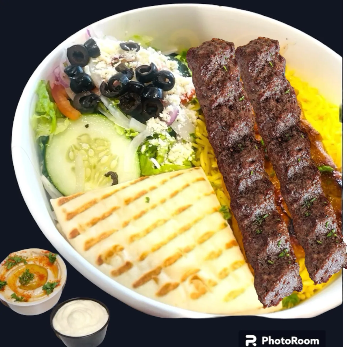 Served with rice, tabouleh salad, hummus, baba ganoush, domas, falafel, pita bread, and tzatziki sauce.