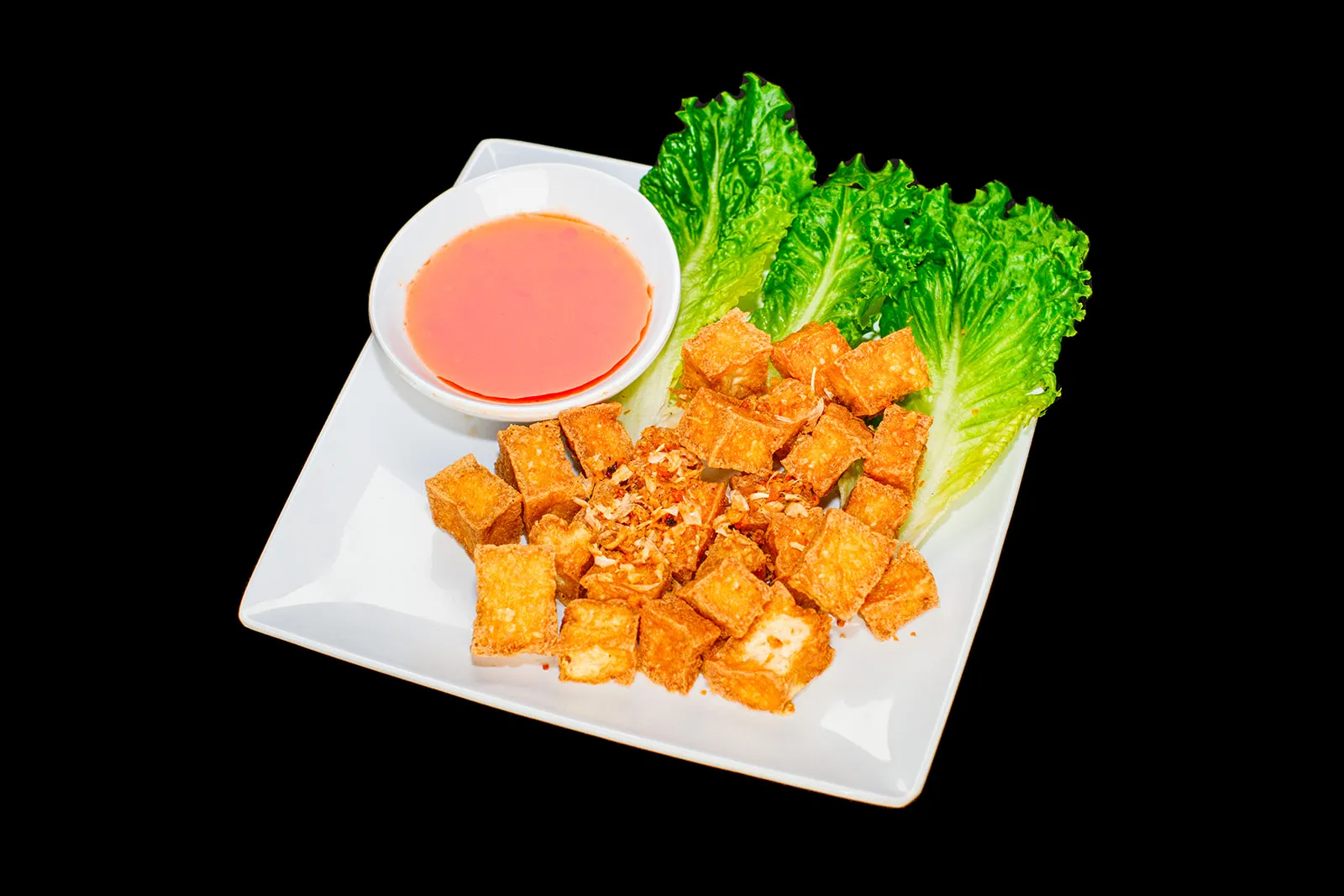 4 Pieces. Big pieces of deep fried tofu, garnished with fried garlic, peanut sauce on side