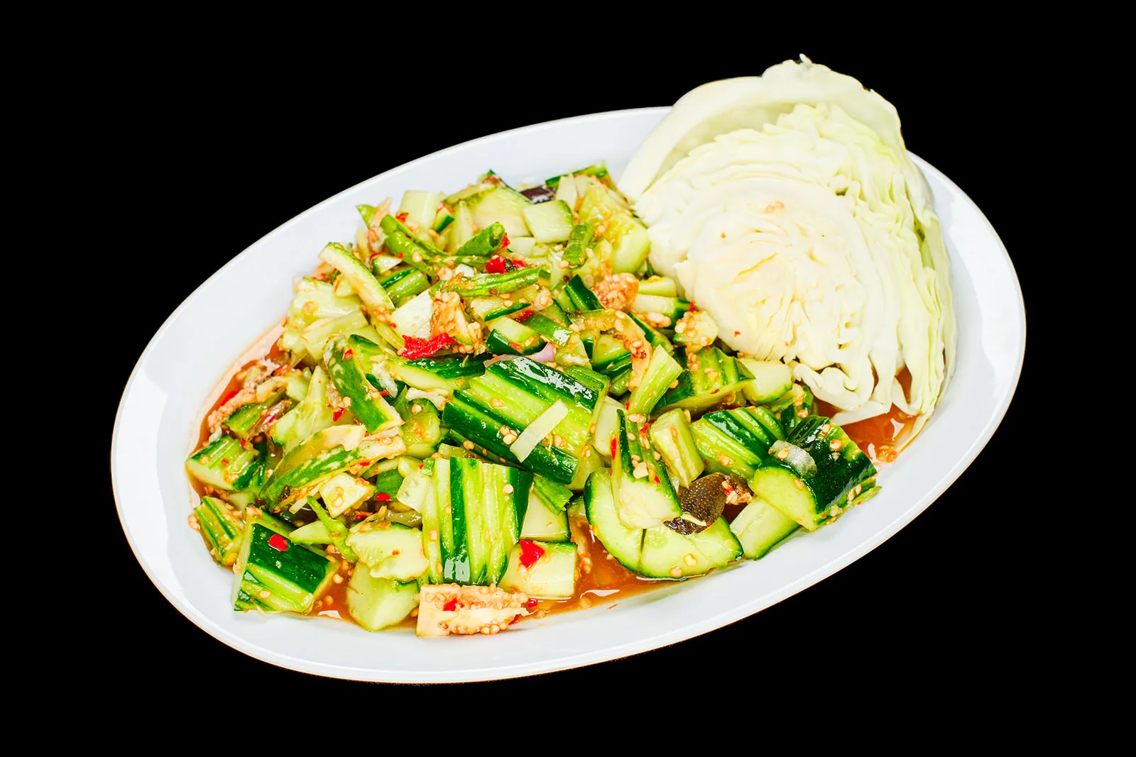 Pasta Noodles, Sriracha Hot Sauce Base, Mixed in With Fried Garlic, Roasted Bean Powder, Cabbage and Cucumber