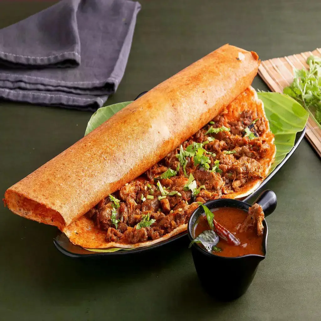 Embark on a culinary adventure with our Mutton Dosa, a delectable fusion of South Indian dosa and succulent mutton curry. Our dosa is generously filled with tender pieces of mutton cooked to perfection in a rich and flavorful curry sauce, infused with aromatic spices and herbs.