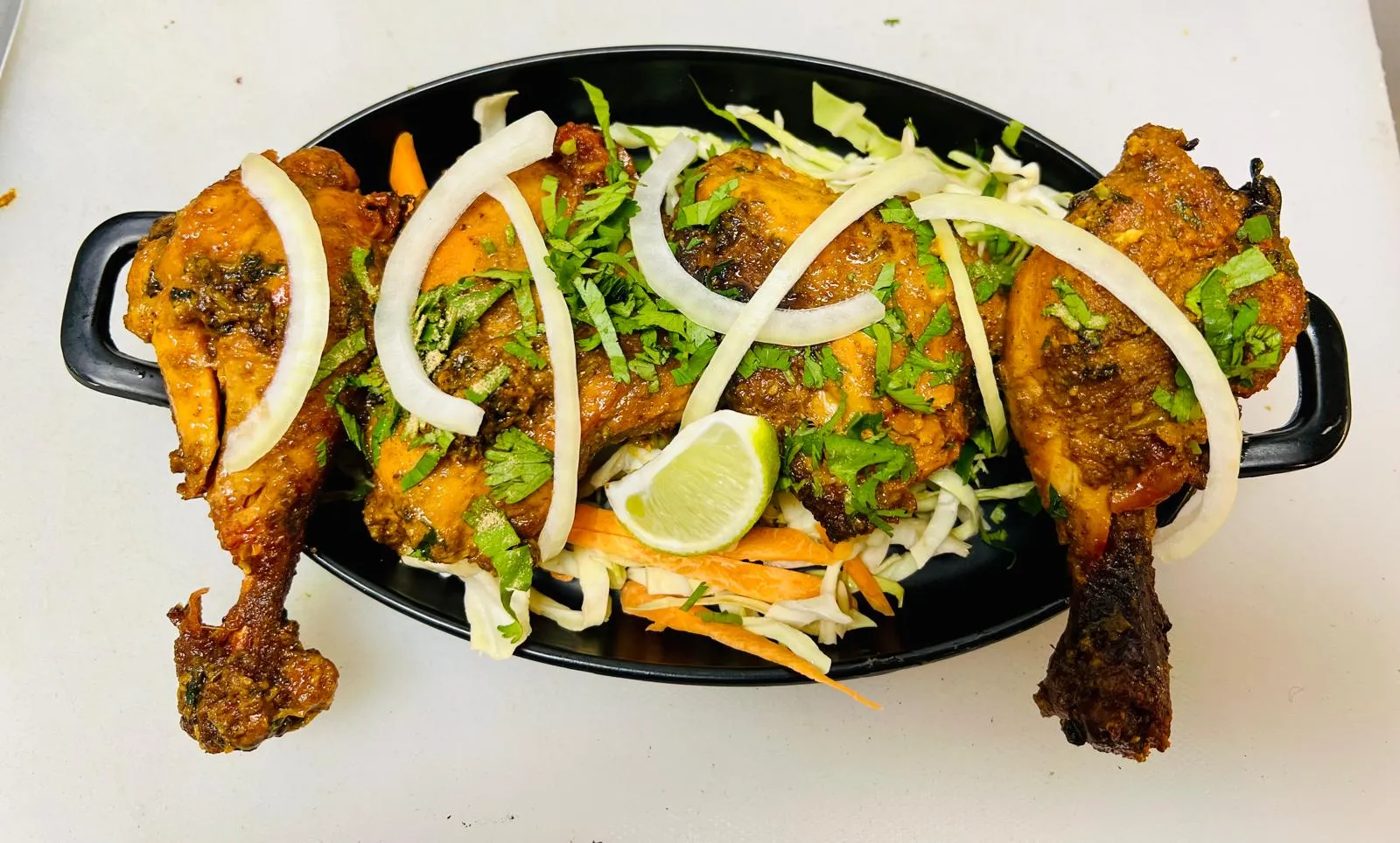 Half - 2 Leg Quarters, Chicken is marinated in a blend of yogurt and spices, including aromatic garam masala, tangy lemon juice, and smoky paprika, before being cooked to perfection in a traditional tandoor oven.