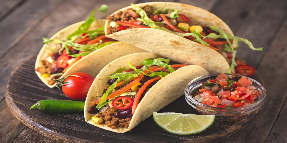 3 Pieces of shrimp tacos served on a soft corn tortilla with cheese, seasoned with pico de gallo, accompanied with rice, lettuce, avocado, corn and salsa on the side.
