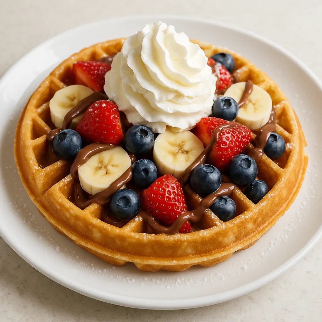 A crispy waffle topped with a dollop of fresh whipped cream, a dusting of powdered sugar, and your choice of delightful sauce.