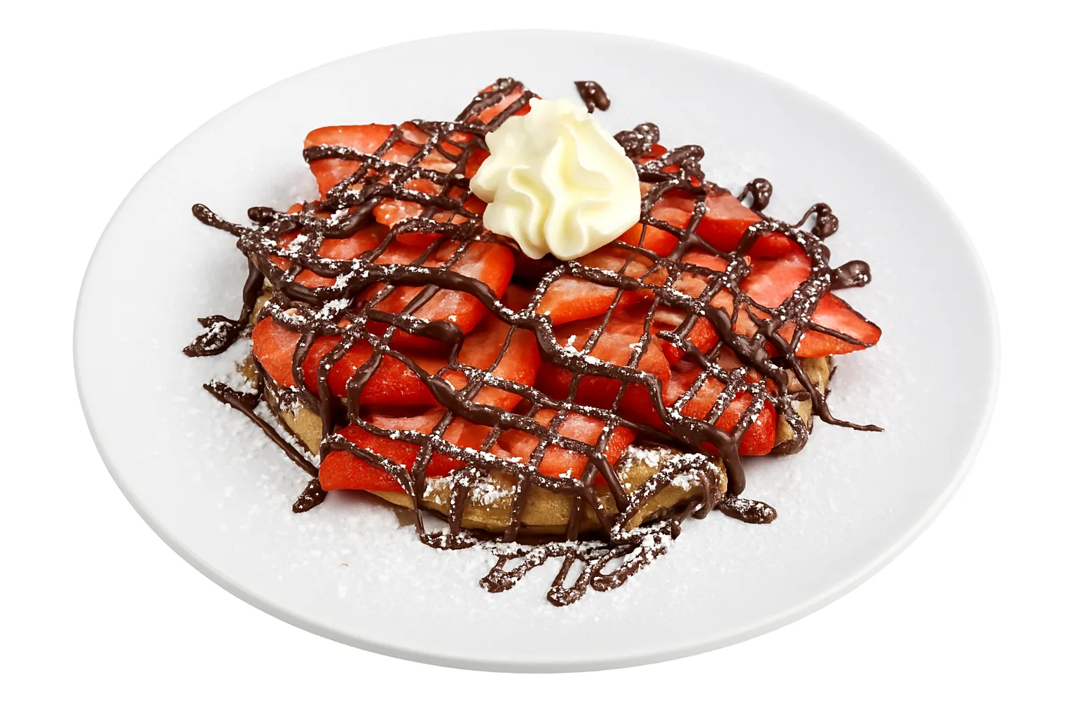 Golden-brown waffle, loaded with fresh, juicy strawberries, dolloped with rich whipped cream, and dusted with a light sprinkling of powdered sugar.