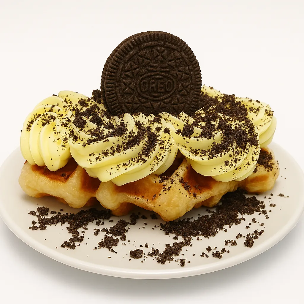 Crushed Oreo cookies layered with fluffy whipped cream, sitting atop a delicate base of crispy croissant waffle.