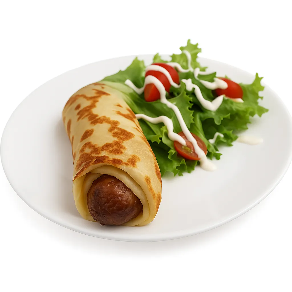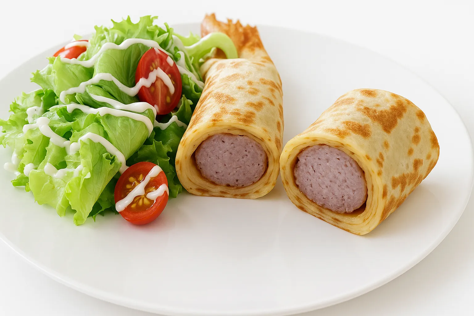 A savory crepe filled with succulent sausage and served alongside a fresh side salad drizzled with creamy ranch sauce.