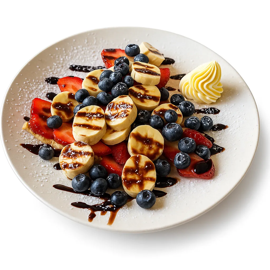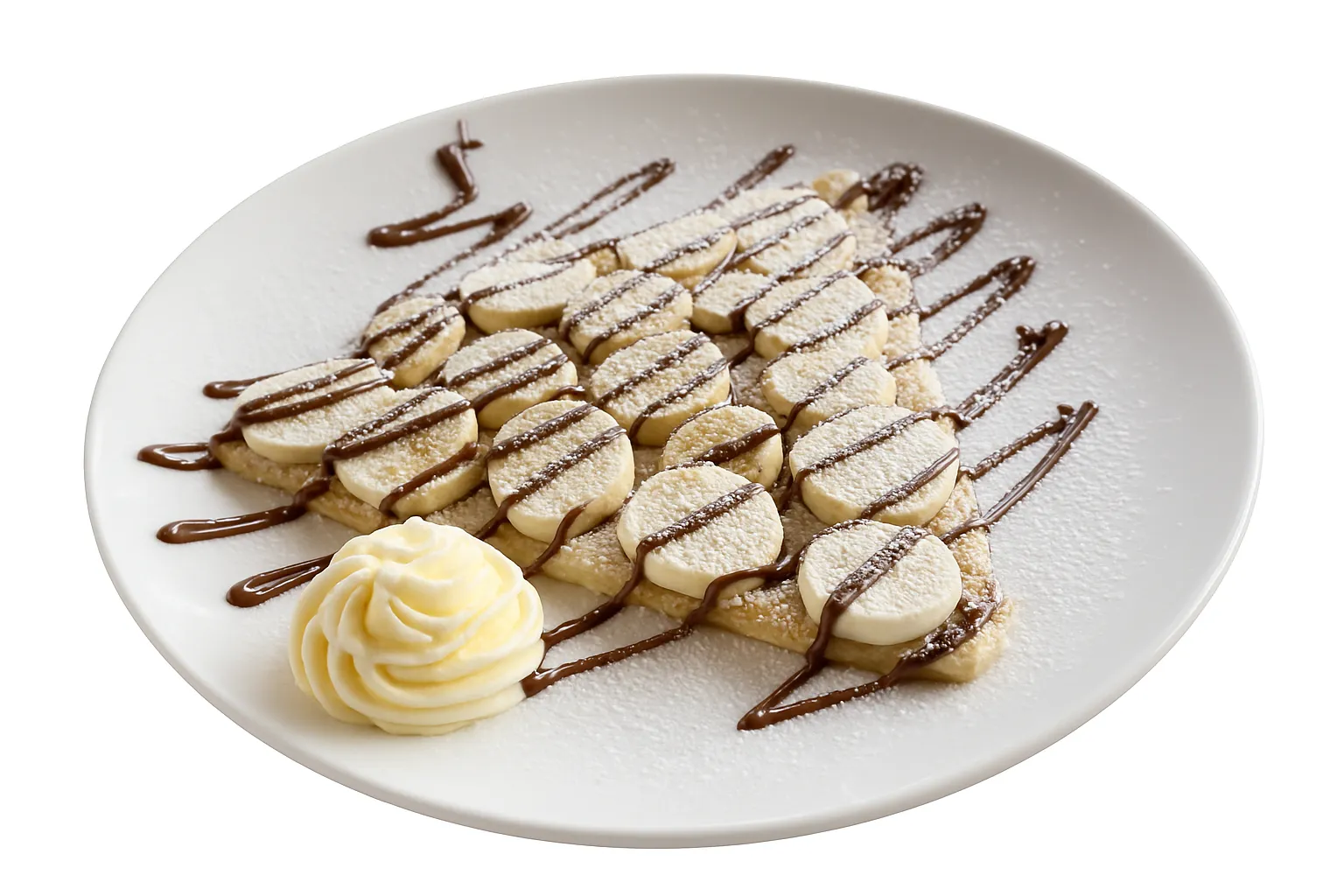 A delicate crepe topped with ripe sliced bananas, drizzled with your favorite sauce, sided with a dollop of fresh cream, and lightly dusted with powdered sugar.