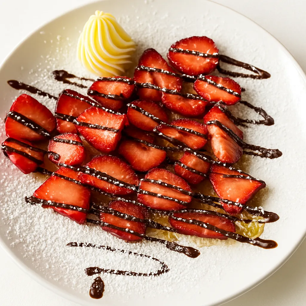 Golden brown pastry, filled with sweet strawberries, drizzled with a rich sauce, and served with a side of fluffy whipped cream.