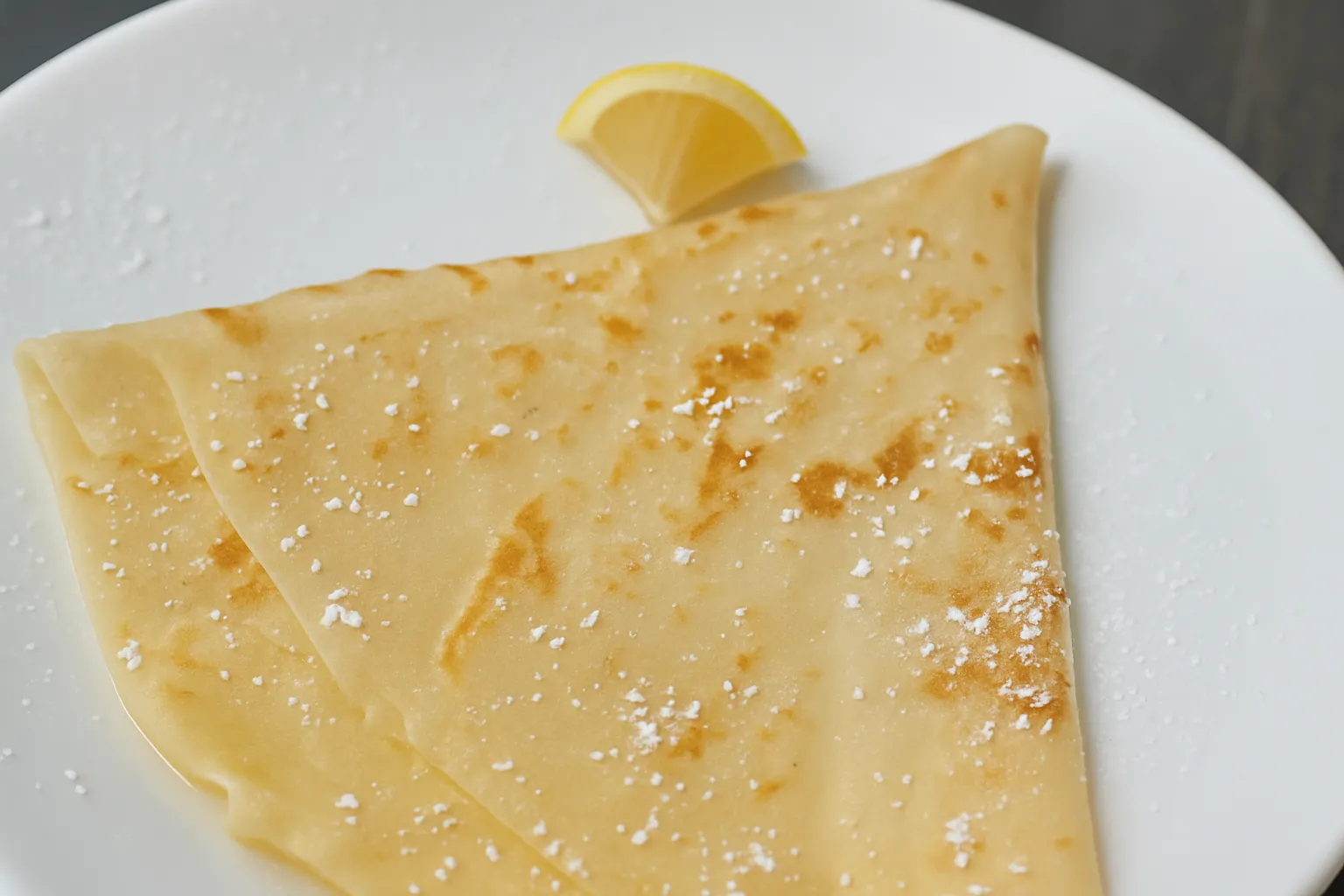 Delicate crêpe topped with a slice of fresh lemon juice and sprinkle of sugar and powdered sugar with whipped cream on the side.