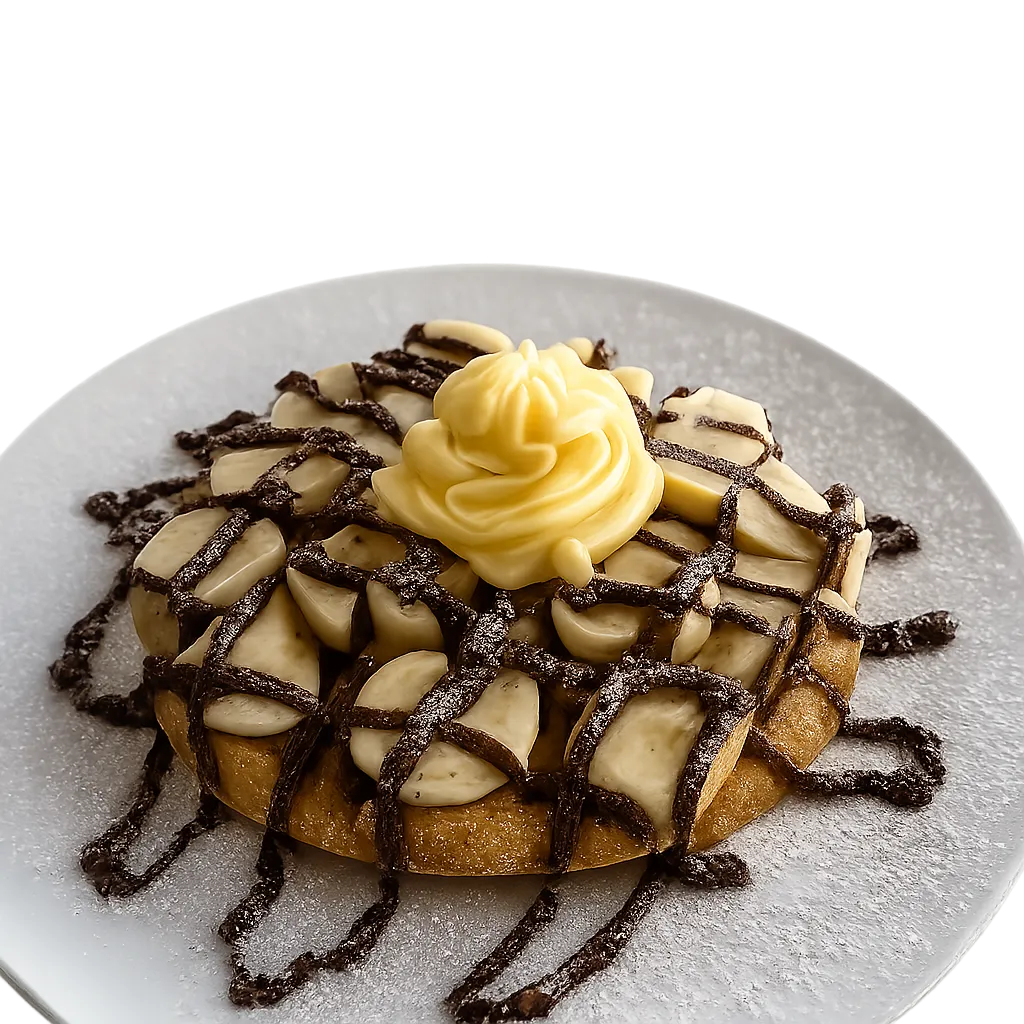 A delightful croffle made from croissant and waffle dough, spread with creamy cream topped with Nutella spread and freshly sliced bananas for a perfect balance of powdered sug....