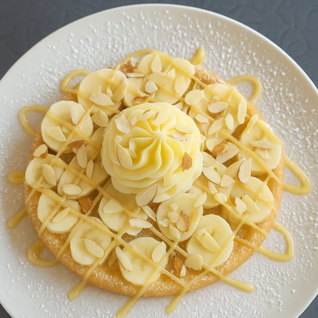 A golden crispy waffle topped with fresh sliced bananas and a generous dollop of whipped cream. Dust of powder sugar.