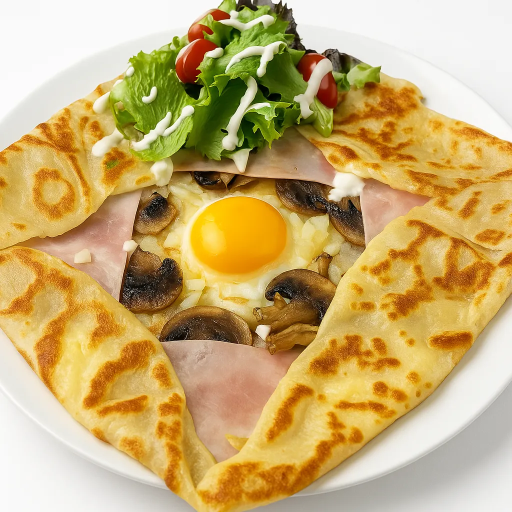Crepe filled with rich tomato sauce, gooey mozzarella cheese, and meat. Served with a refreshing side salad.