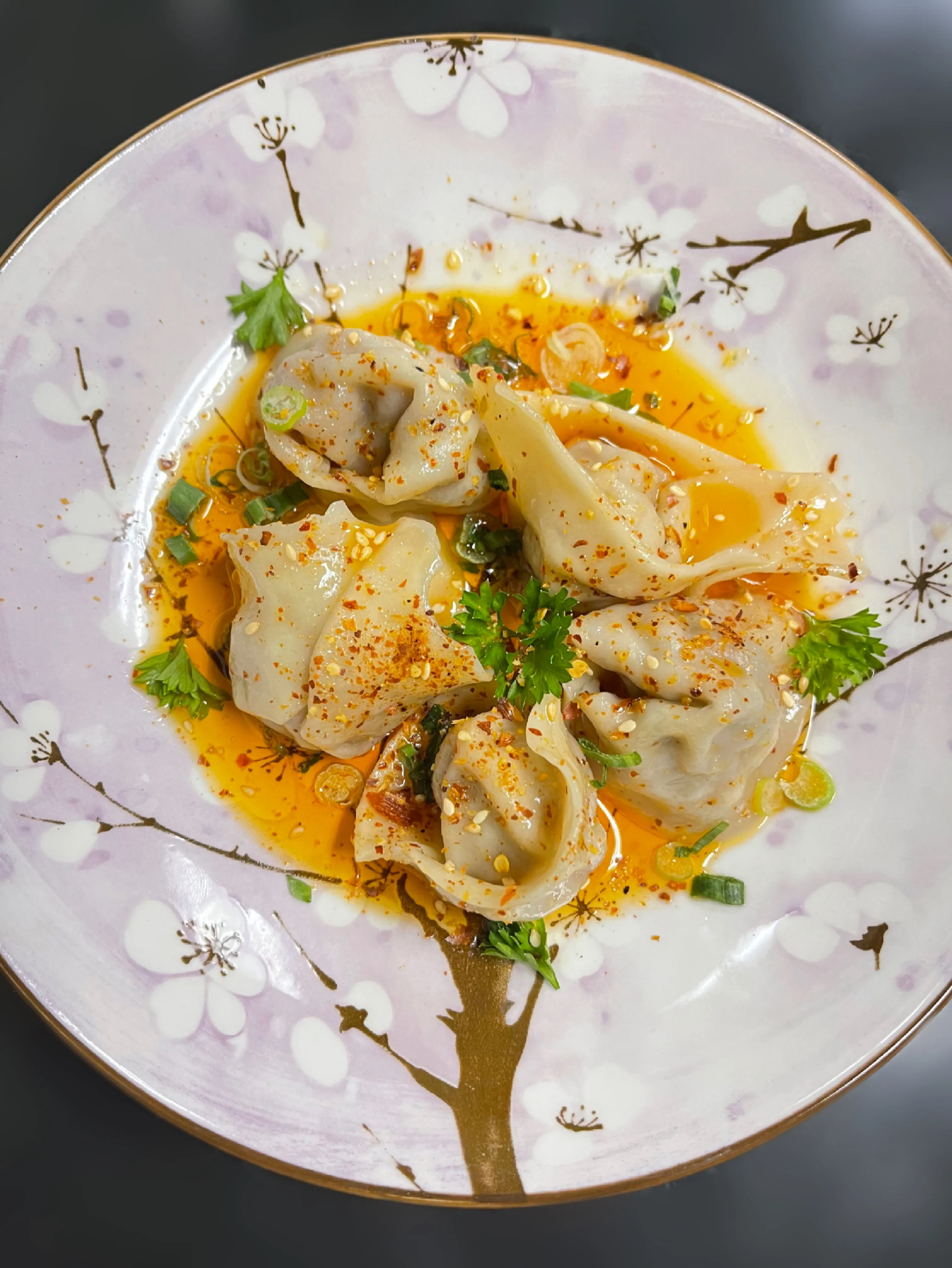 Savory dumplings infused with classic French onion soup flavors, featuring a rich, caramelized onion filling and a touch on Sichuan Chili oil Sauce.