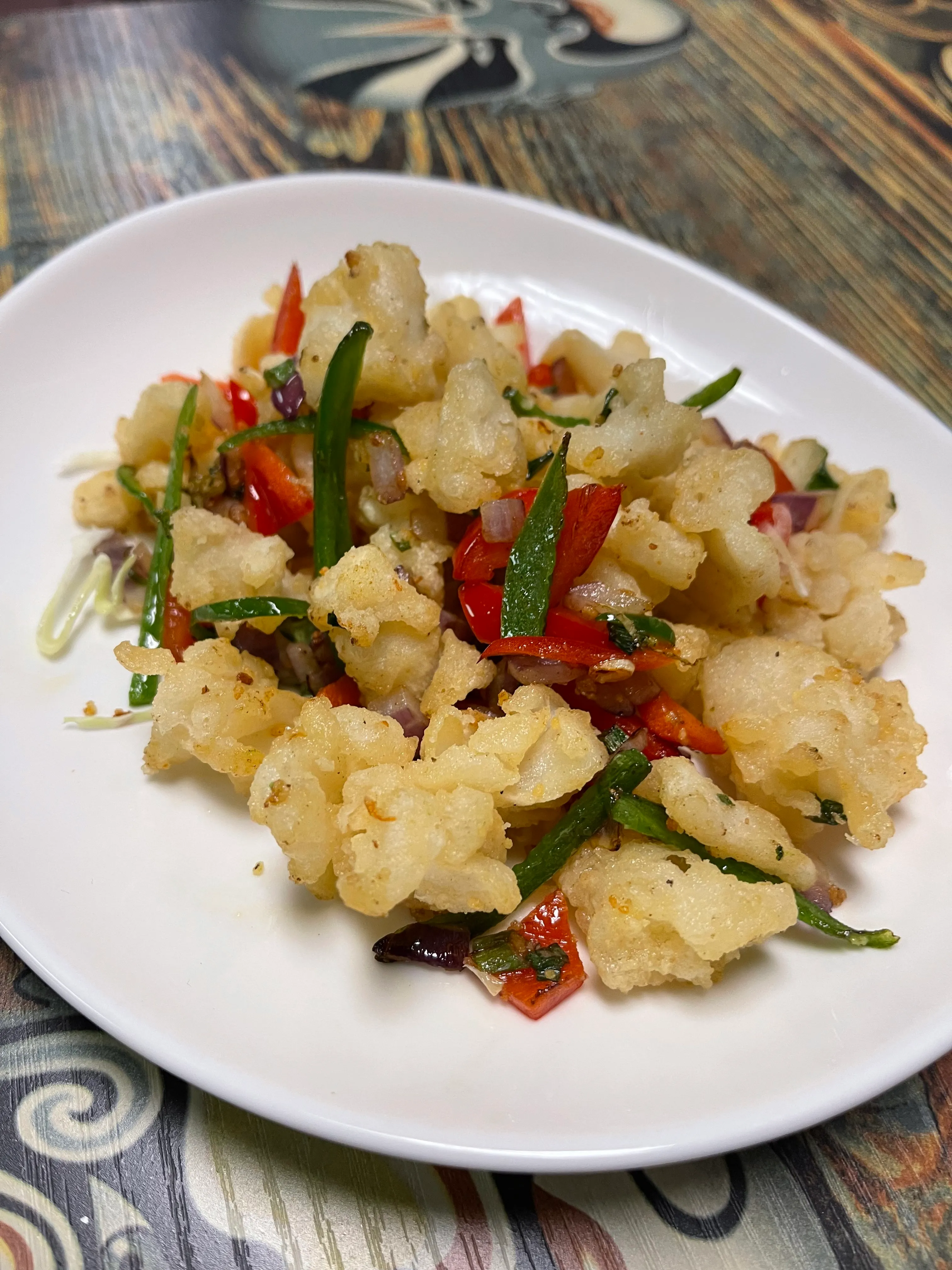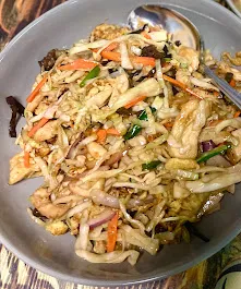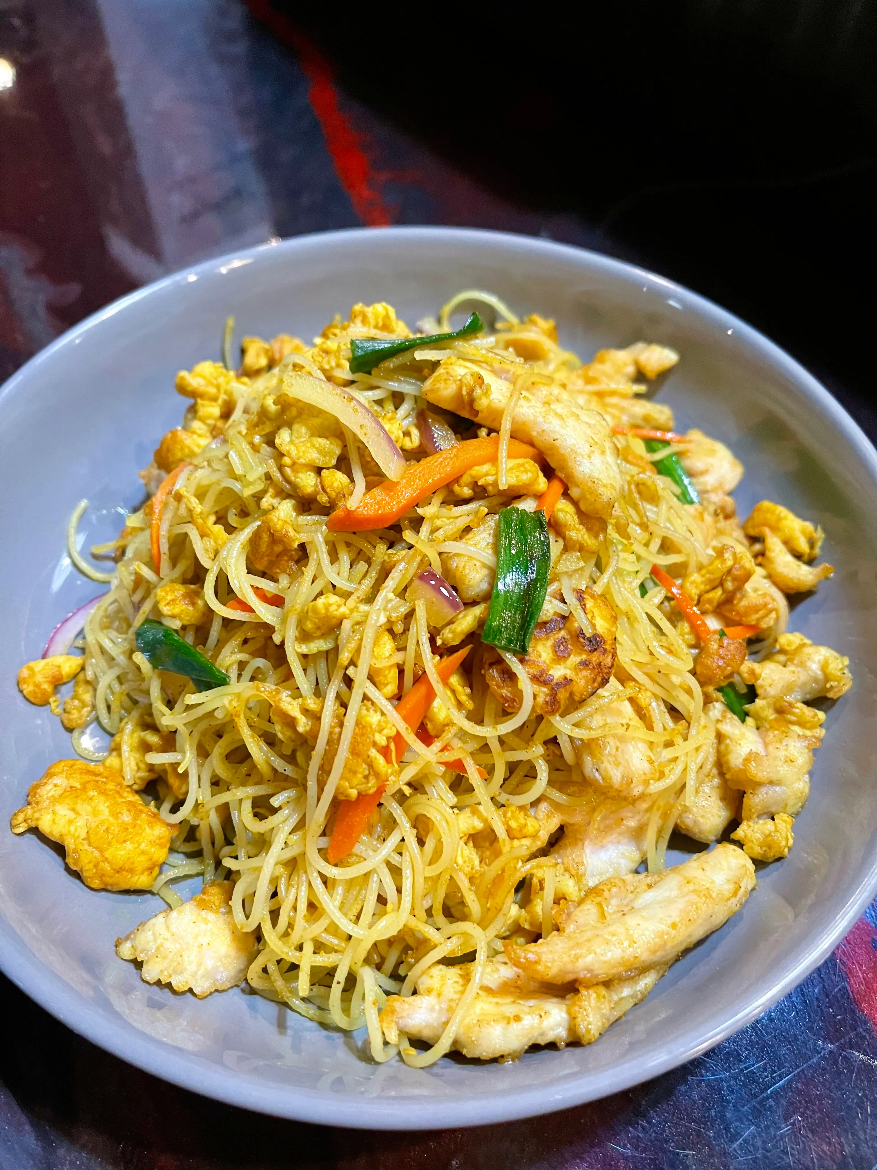 Stir-fried angel hair rice noodles with your choice of protein, eggs, carrots, onions, and scallions, all seasoned with curry powder.