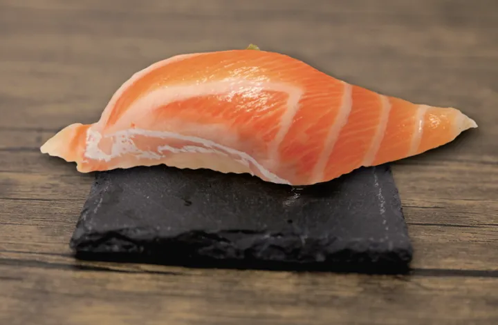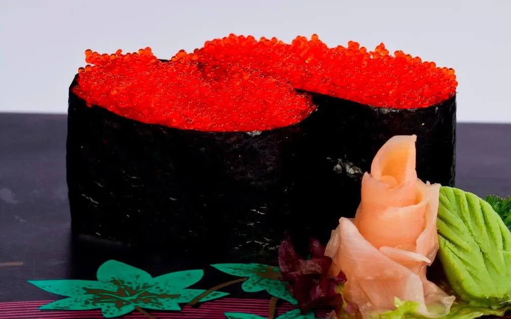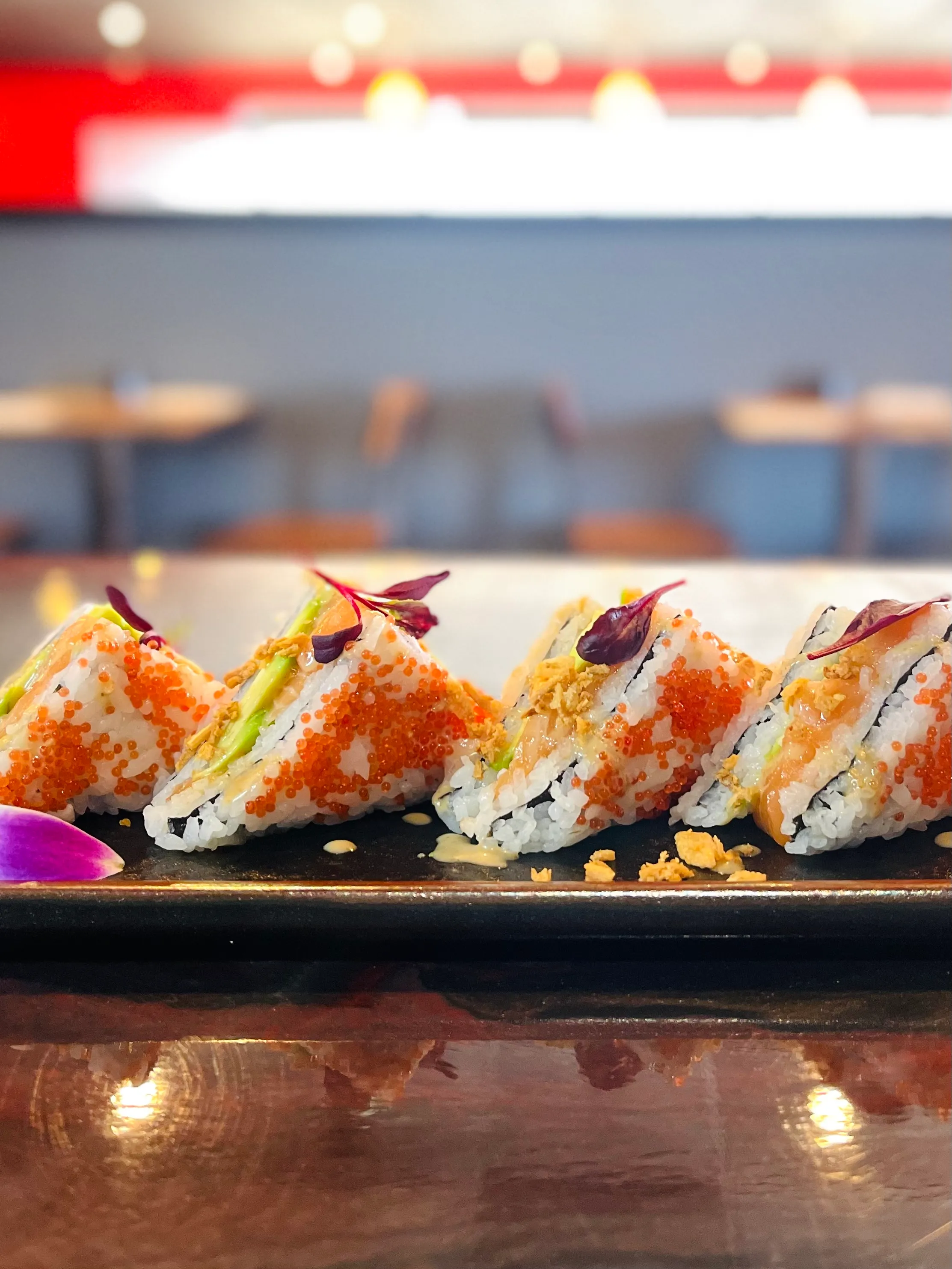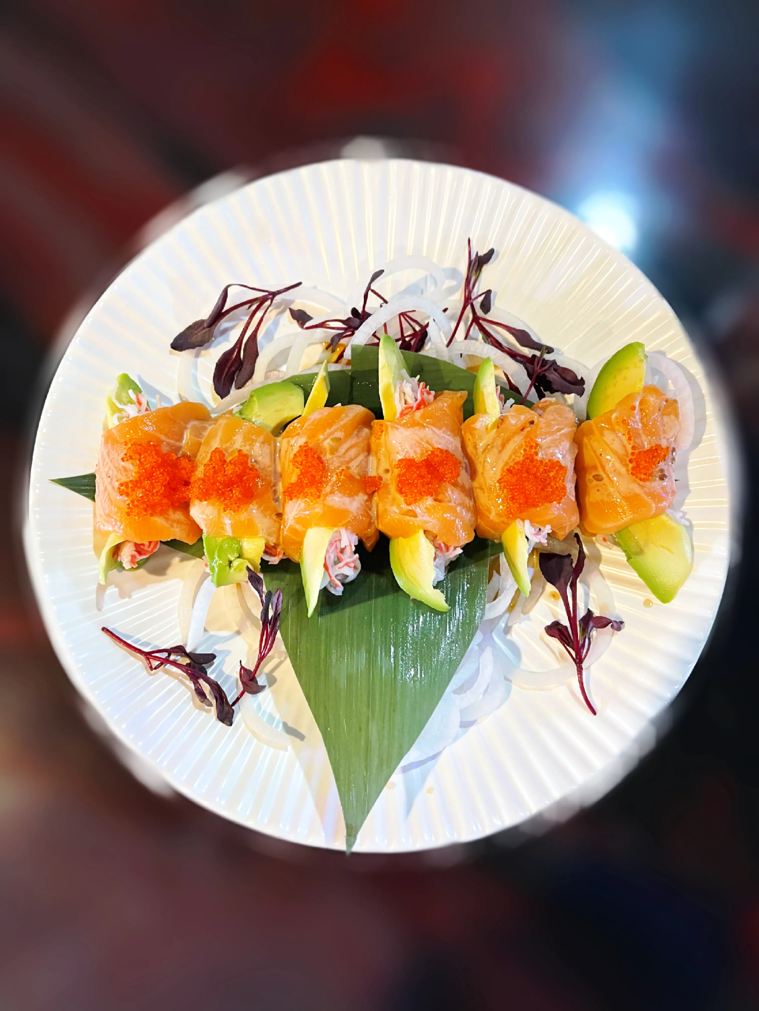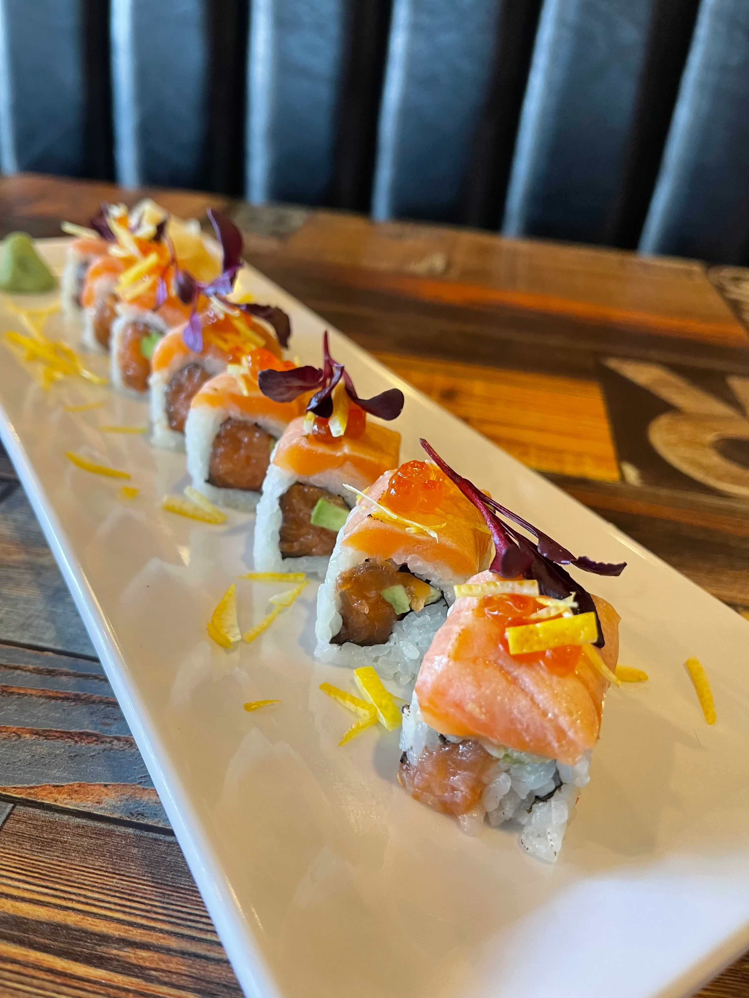 salmon, avocado. Topped with seared salmon, brush with ponzu sauce, ikura, lemon zest.