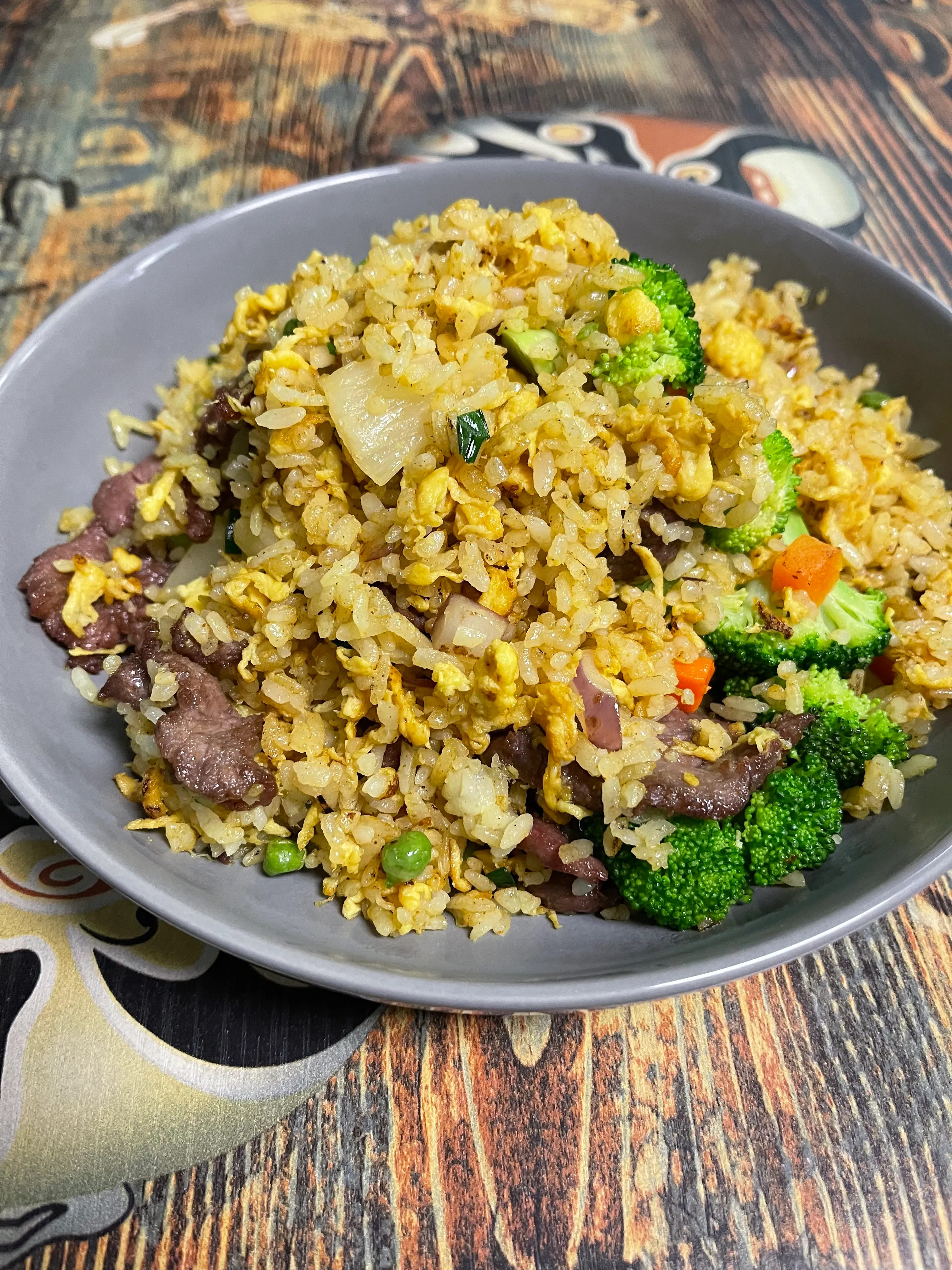 A classic dish with your choice of protein, scrambled eggs, peas, carrots, red and green onions, all stir-fried with a savory soy sauce base.