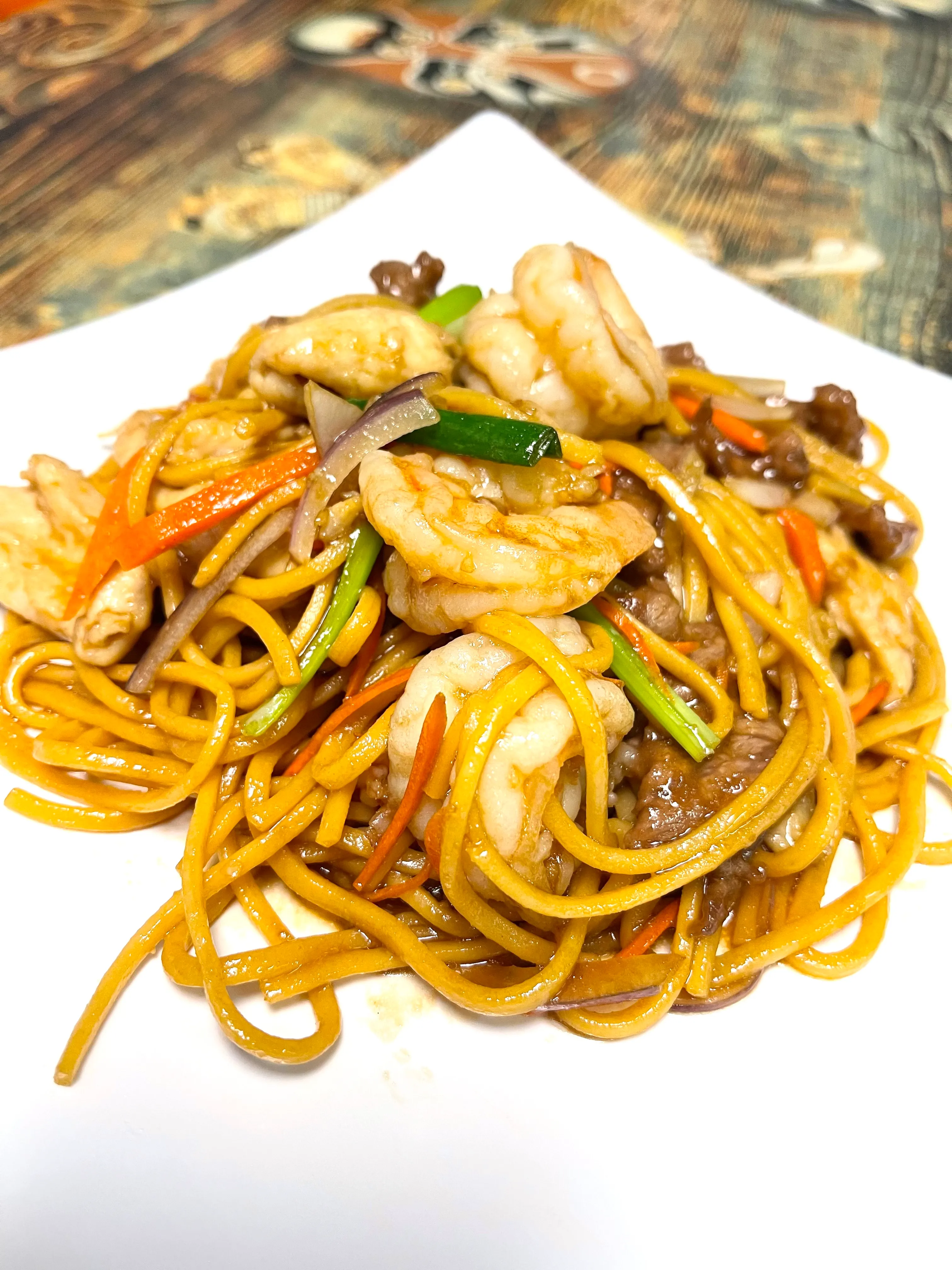 Stir-fry of round egg noodles with your choice of protein, carrots, onions, and scallions, all tossed in a savory soy sauce base.