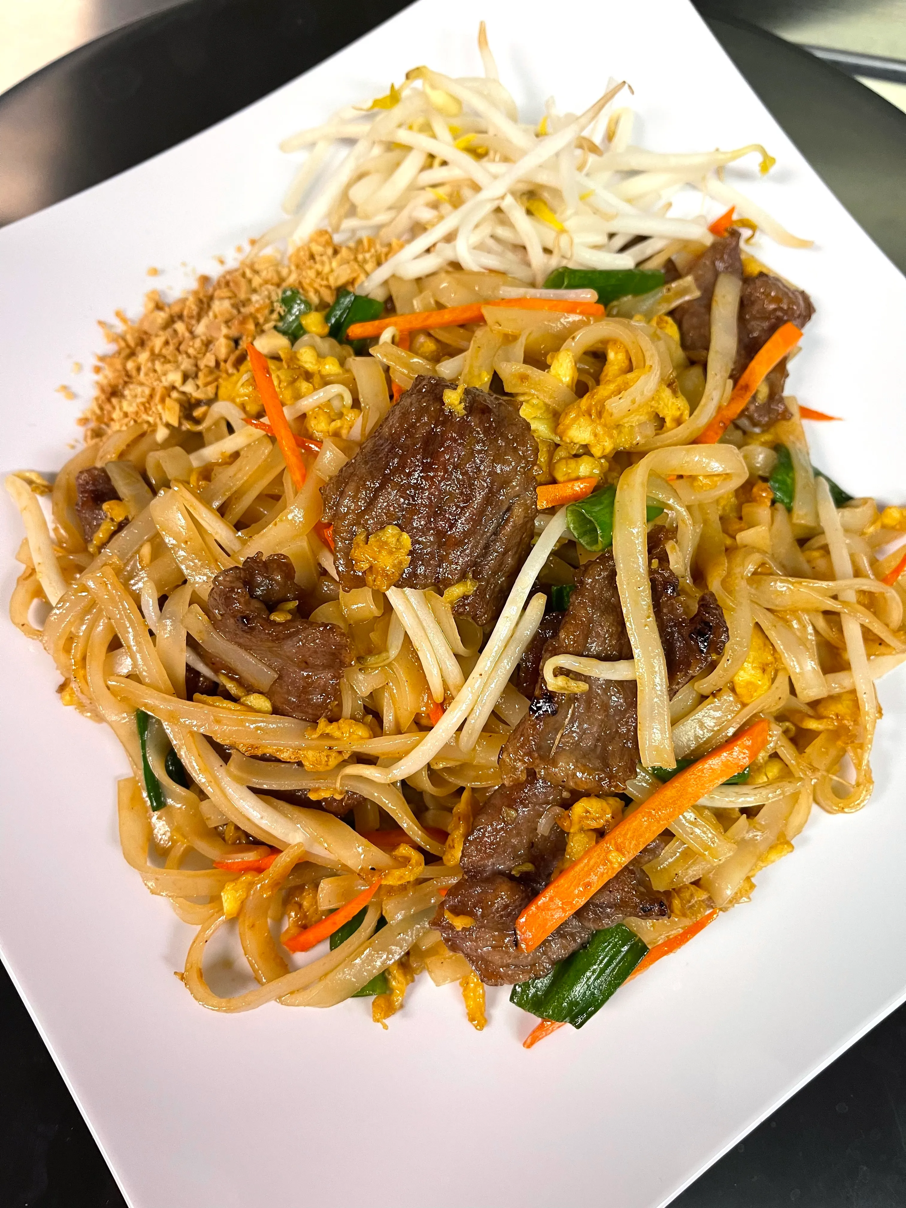 Rice noodles with your choice of protein, eggs, bean sprouts, carrots, scallions, and ground peanuts, all tossed in a sweet and sour tamarind sauce.