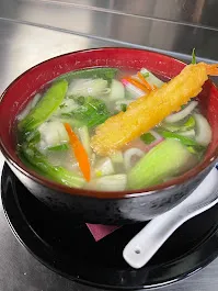 Thick round noodles in rich miso broth, pink-swirl narutomaki fish cake, vegetables, and scallions, side of shrimp tempura.