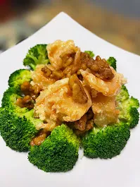 Lightly breaded shrimp in a creamy sweet mayo sauce, topped with glazed walnuts and served over steamed broccoli. Served with side of white rice.