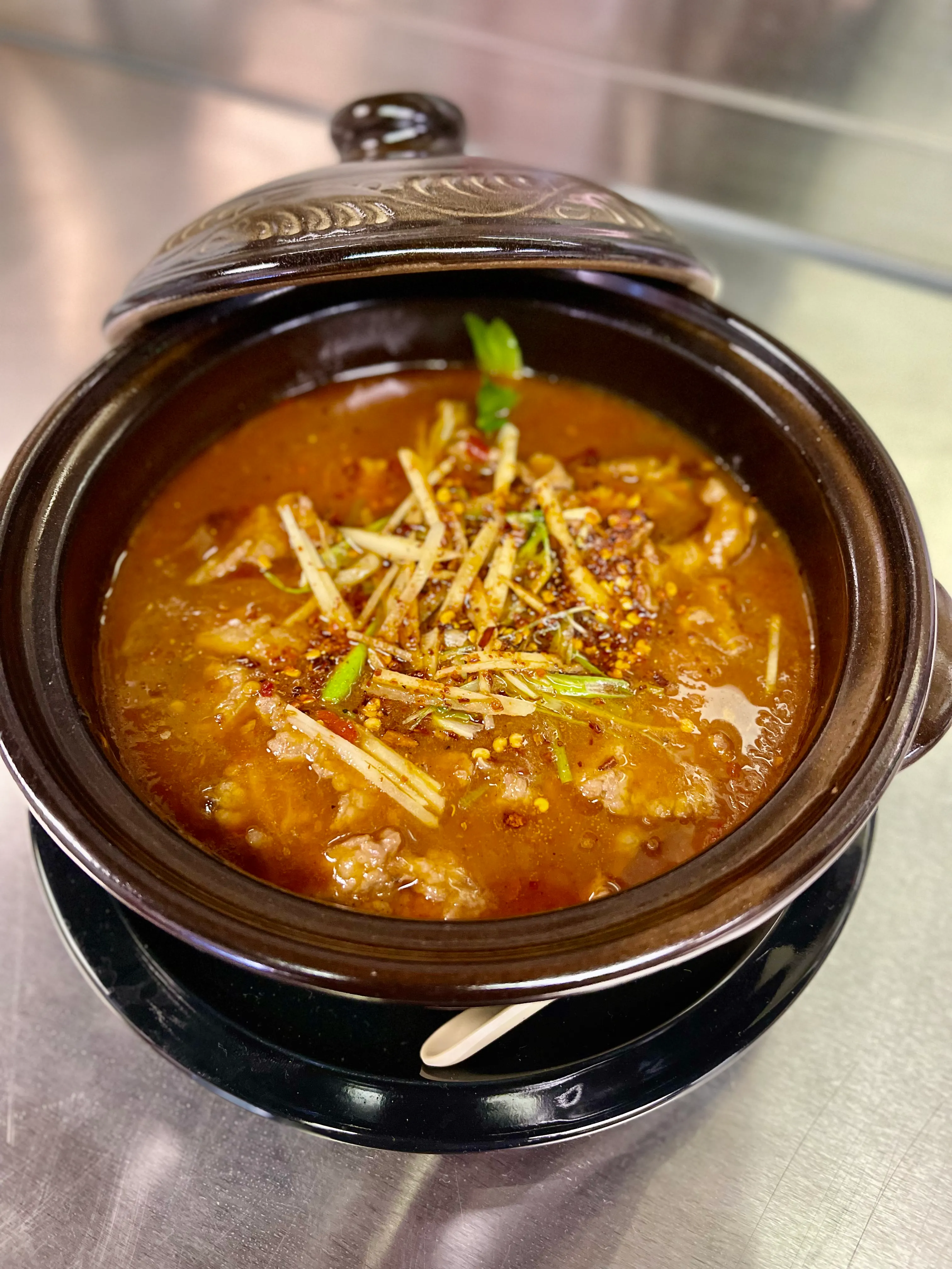 A flavorful hot pot with a spicy Szechuan broth, featuring fresh baby bok choy, ginger, and scallions. Choose between beef ($20.95) or seafood ($25.95) for your main ingredient.