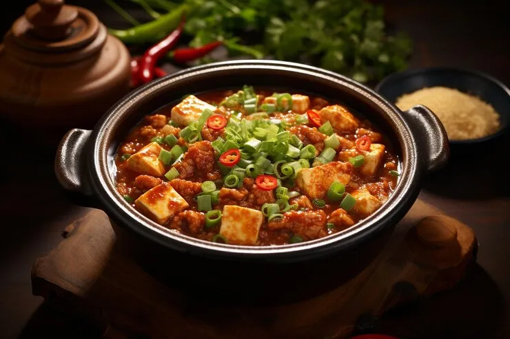 A classic Sichuan dish featuring silky tofu in a spicy, aromatic sauce made with ground beef, fermented bean paste, garlic, and chili oil. Served with white rice.