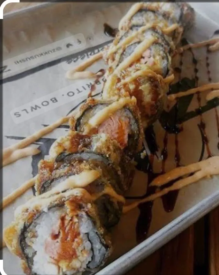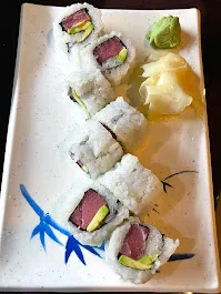 Tempura roll ahi tuna ,cucumber,mango,avocado,asparagus,inside out finishes with ponzu sauce
