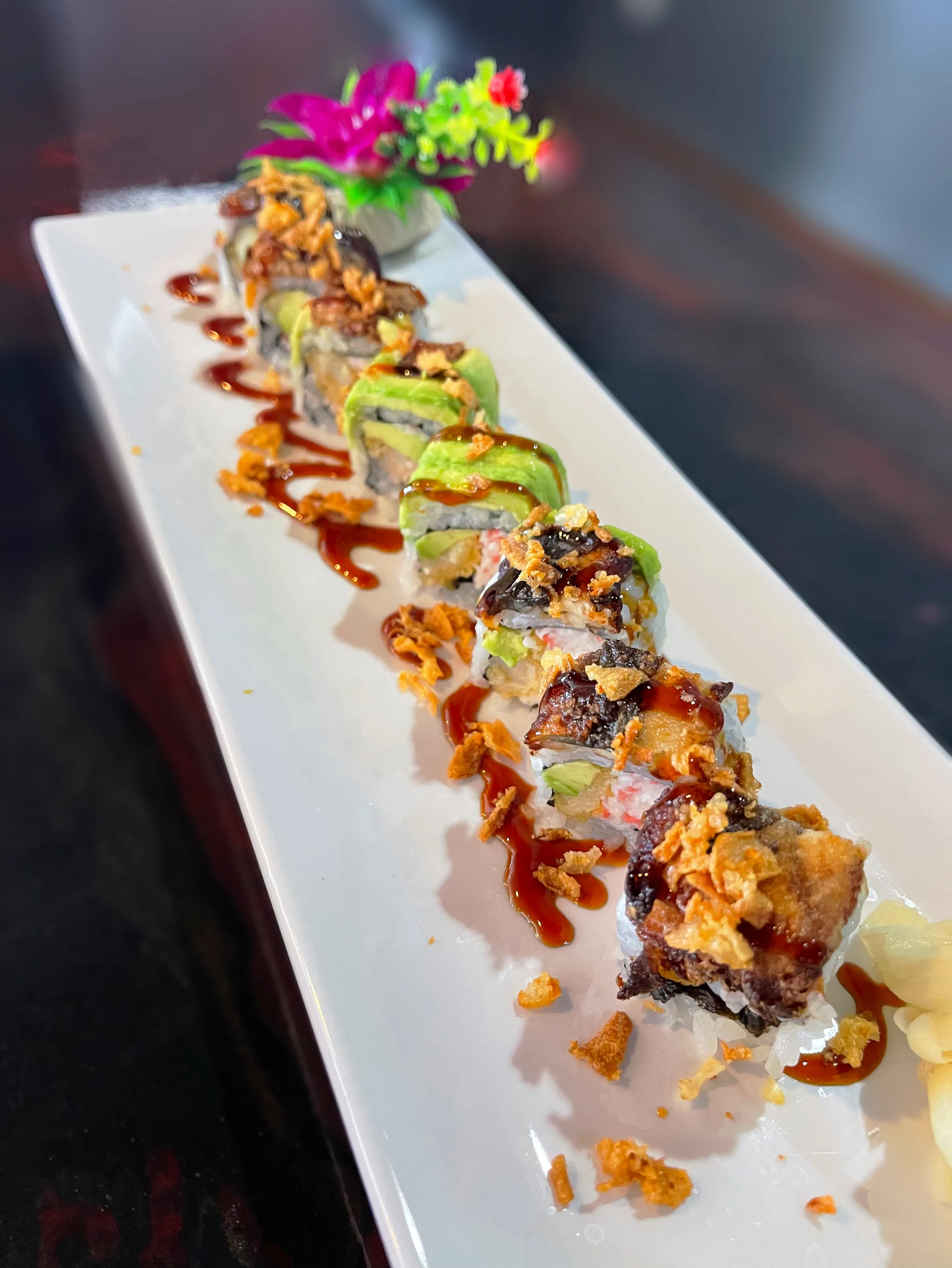 Shrimp tempura, crab mixed inside topped eel, avocado, eel sauce and crunchy shallots.