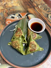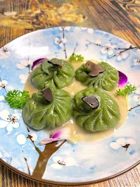 Steamed and lightly pan seared dumplings filled with a vibrant mix of baby spinach, mushrooms, and carrots, offering a fresh and savory bite.