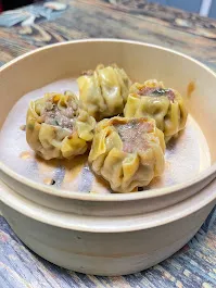 Steamed open-face dumplings with a vibrant yellow wrapper, filled with a savory blend of seasoned pork.