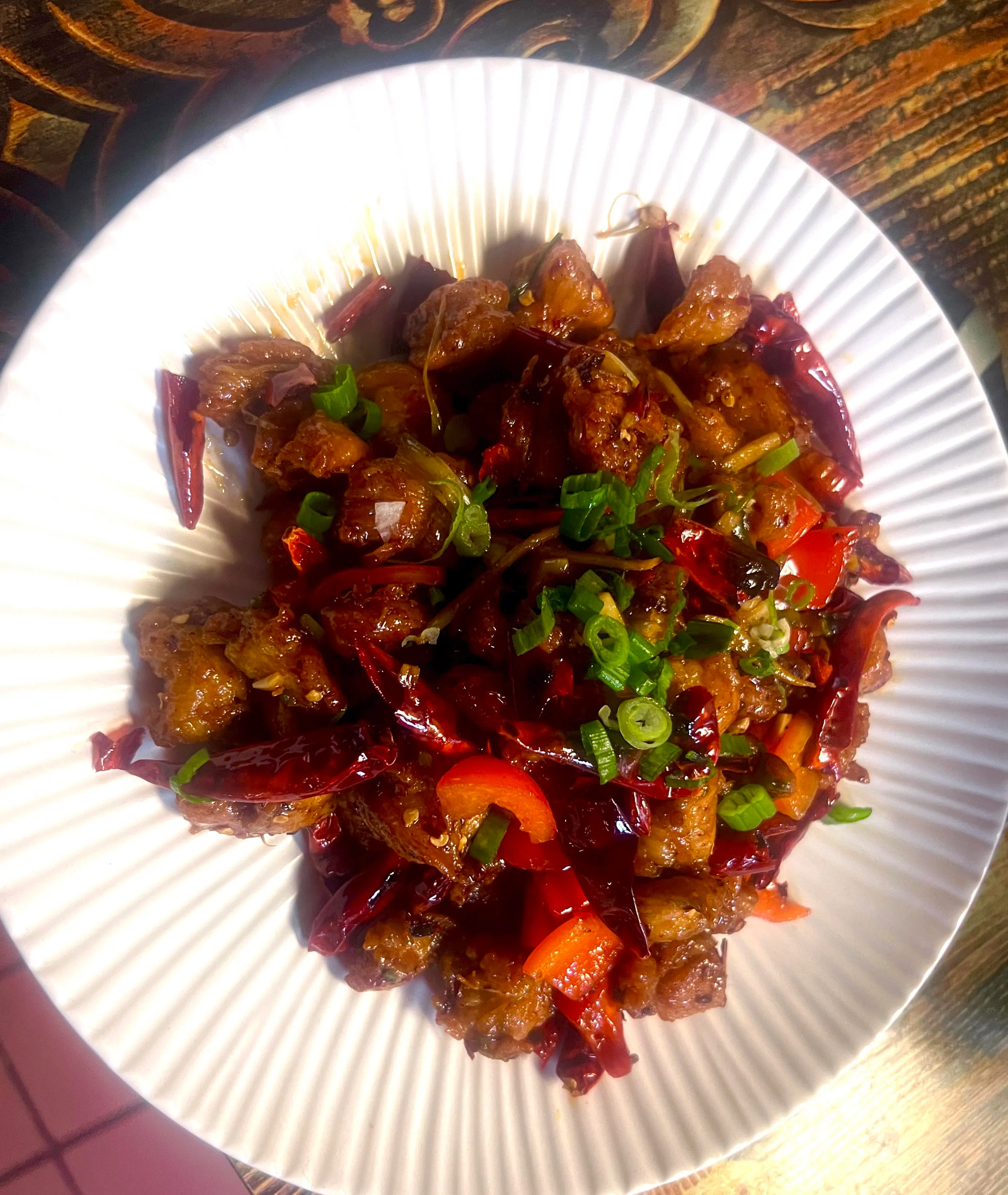 Wok-tossed chicken,red bell peppers,ginger,garlic,dried chili pepper,green onions