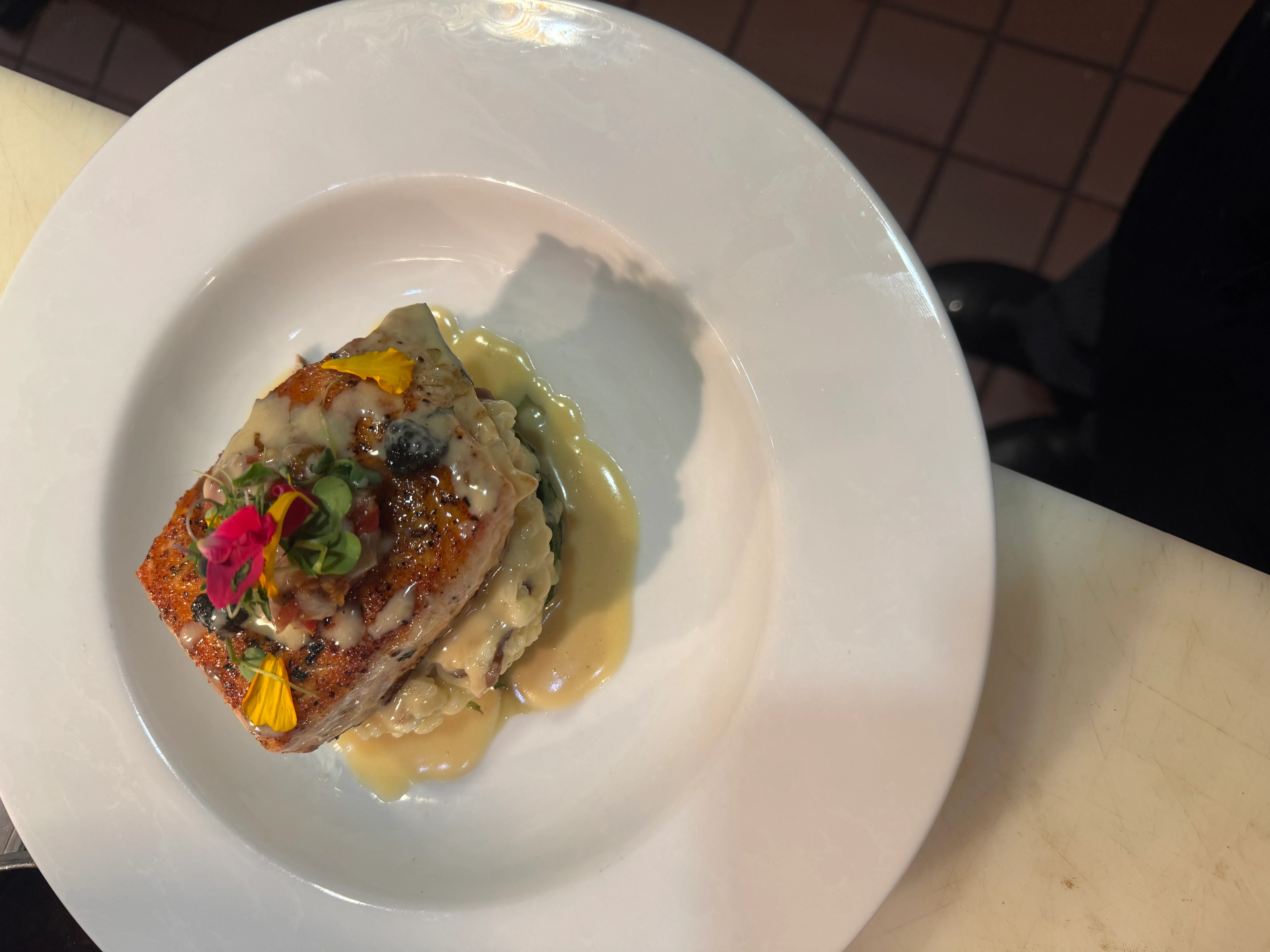 Half Cajun Marinated Chicken, Yellow Stone Grits, Broccolini, Chicken Jus