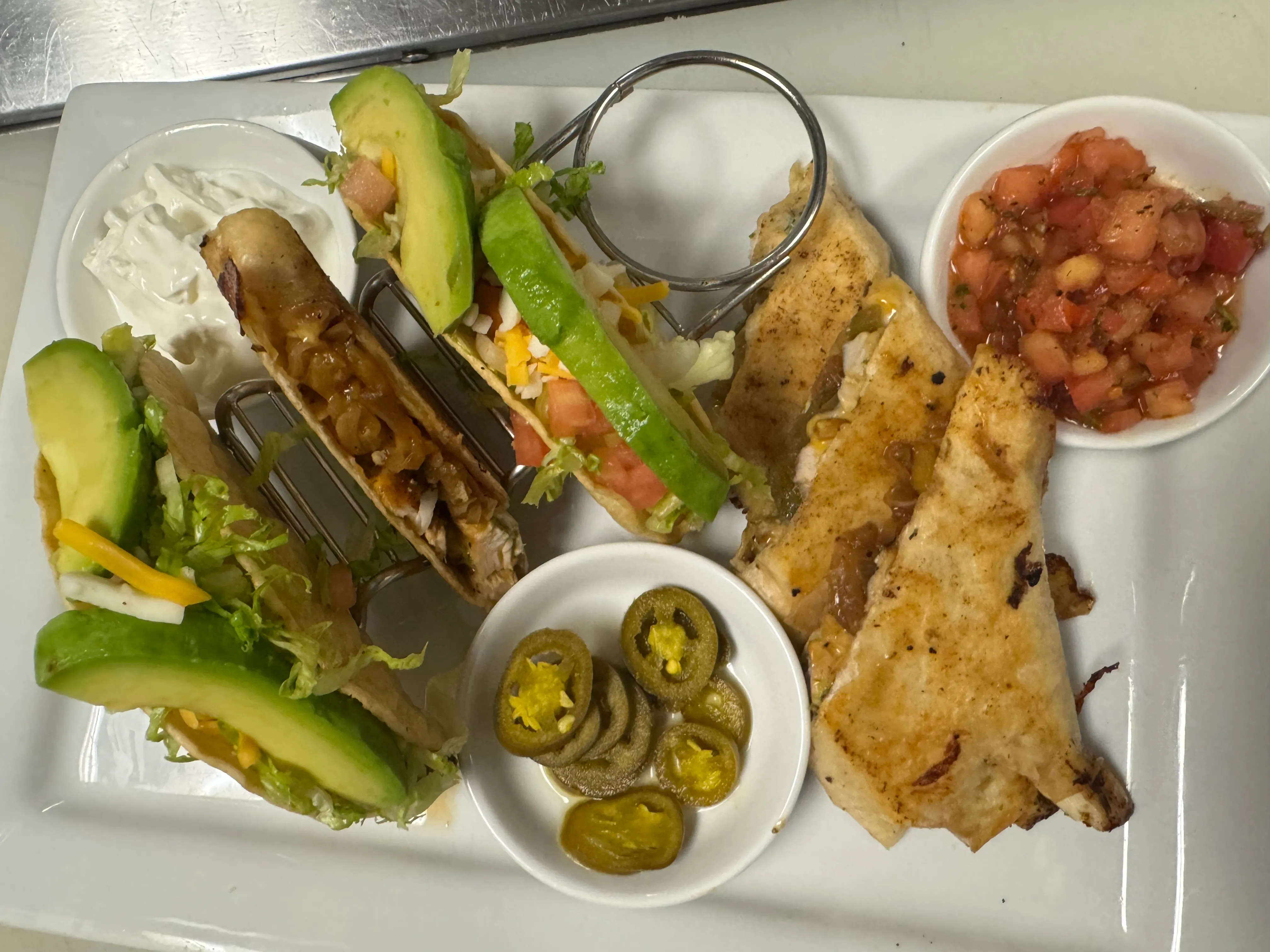 Ground Beef Quesadilla, Cheese Dip With Chorizo And Chicken Flauta Served With Lettuce, Pico De Gallo, Sour Cream, Queso Fresco, And Your Favorite Green Or Red Sauce