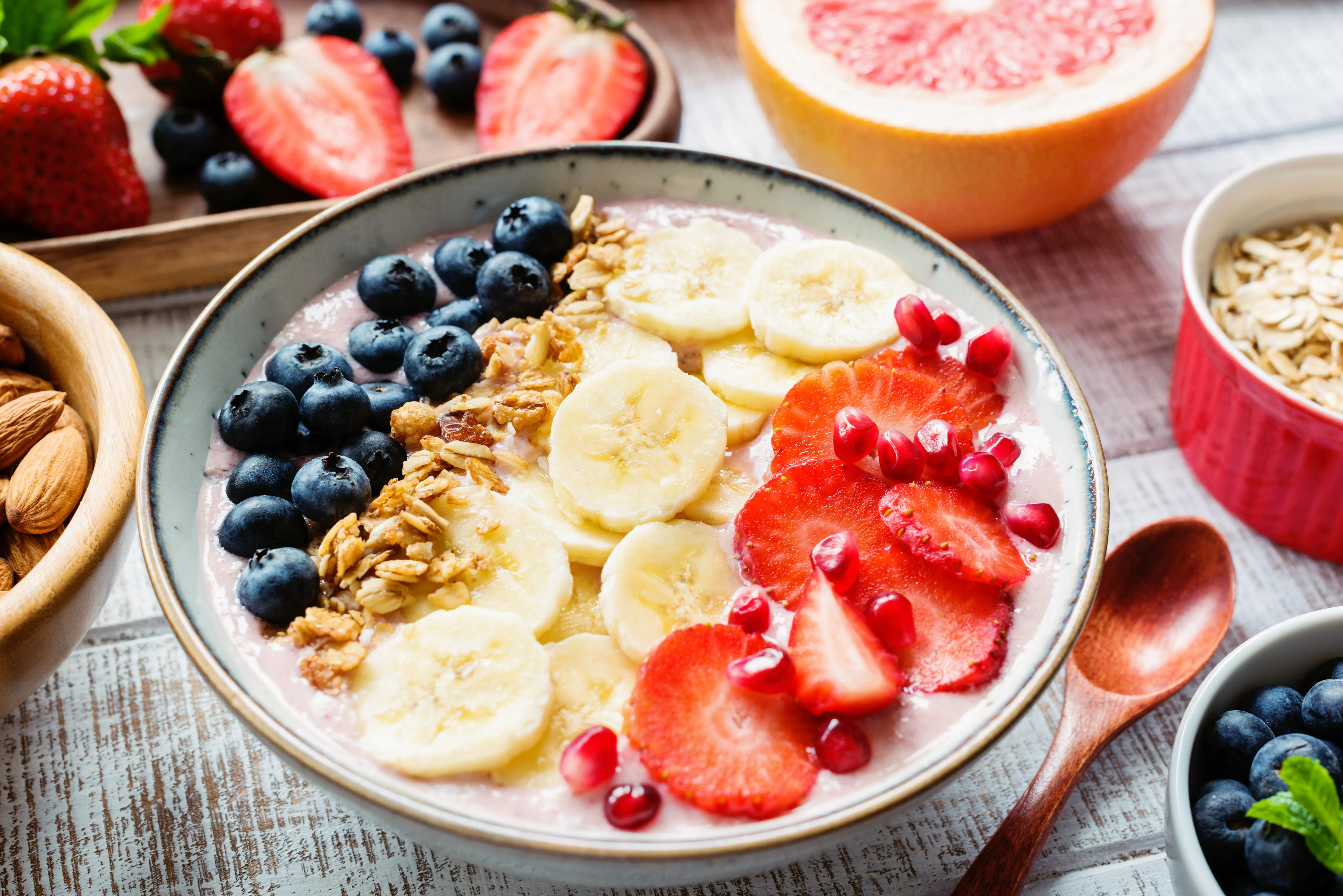 Acai, Raspberry, Banana, Granola, Strawberries, Blueberries, Agave, Coconut Flakes
