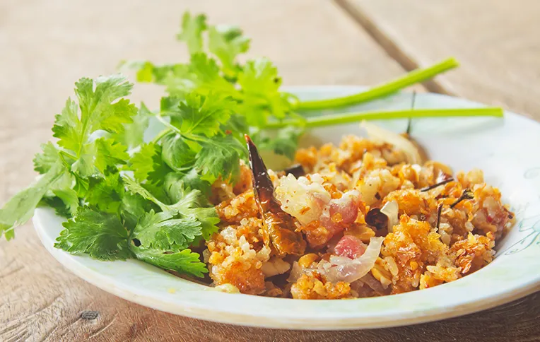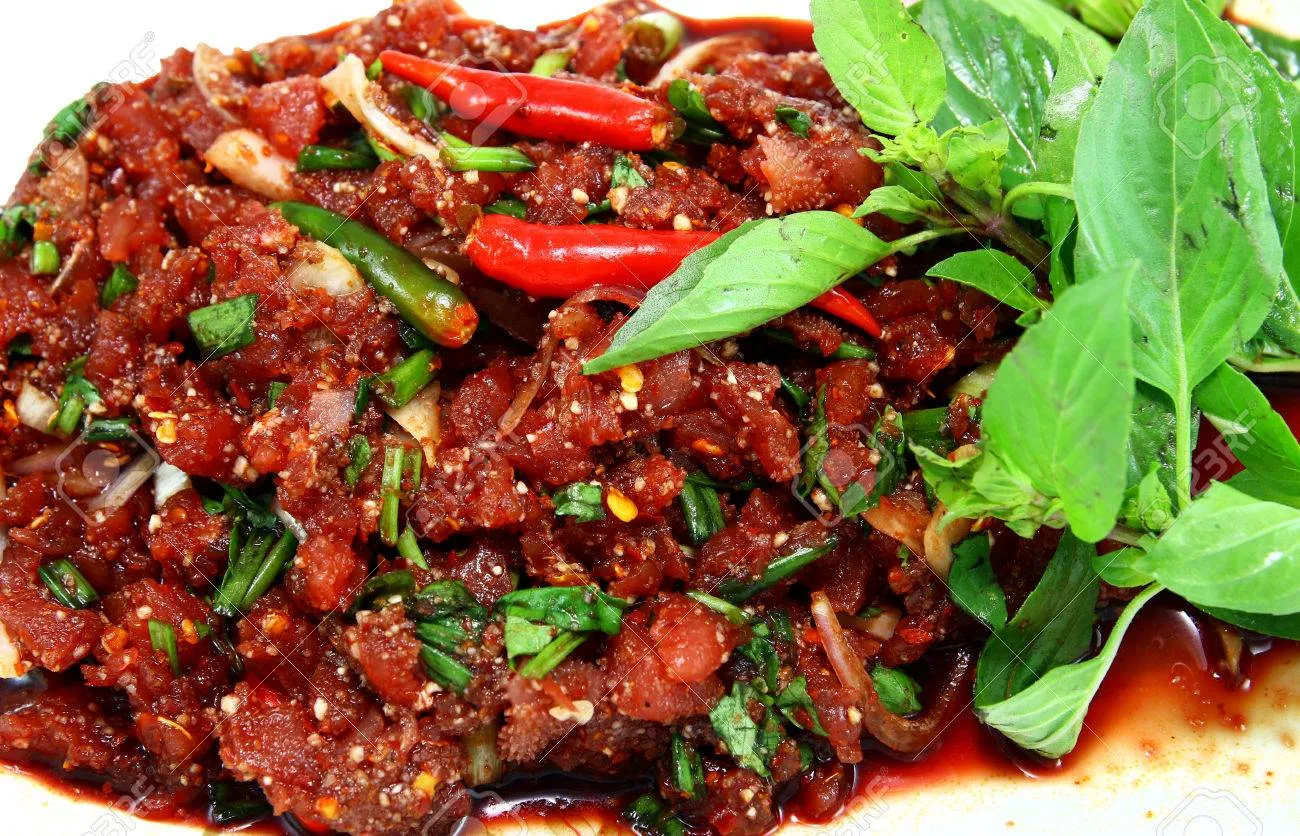 and grounded rice Serve with fresh lettuce, eggplant, long bean, and cucumbers.