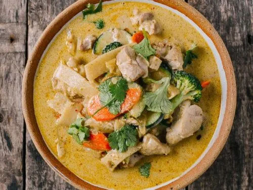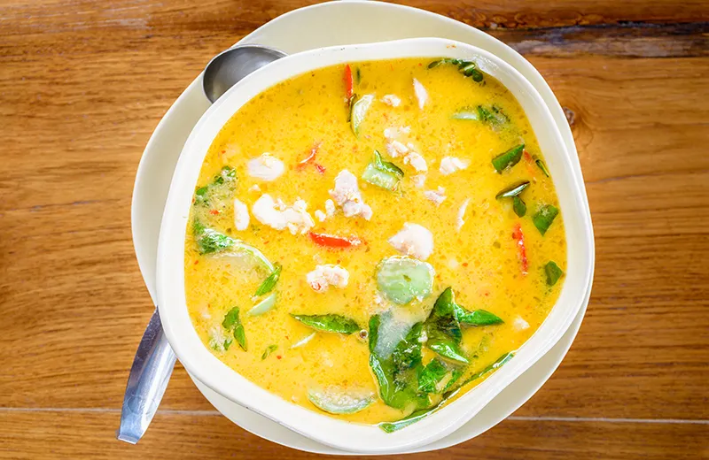 Flavored with yellow curry, Thai chili pasted, a choice of meat, with coconut milk, bamboo, Thai chili, green bean, Thai eggplant, and basil leaves.