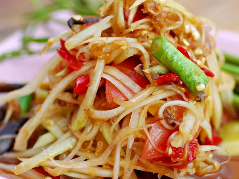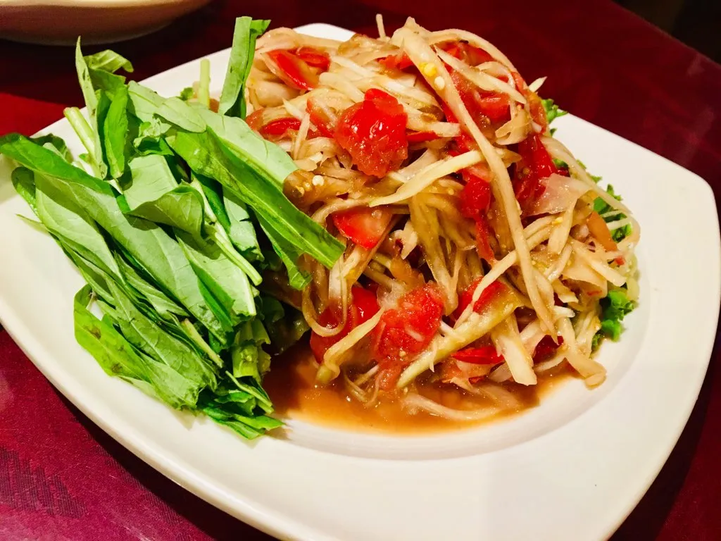 Thai-style papaya salad with shredded green papaya, tomatoes, garlic, fresh lime,