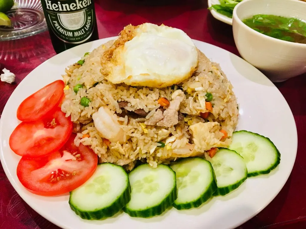 Stir-fried rice with eggs, choice of proteins, and customizable vegetables.