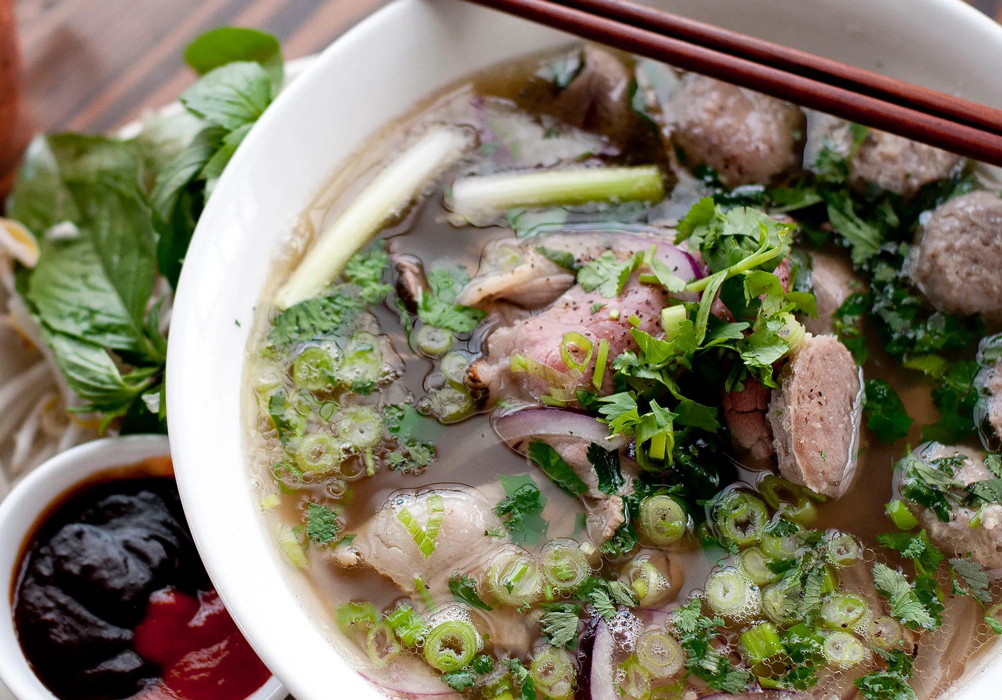 Customize your Pho! Select your rice noodles (flat or thin) and your choice of proteins. Top with green onion, cilantro, and fried garlic. Serve wi....