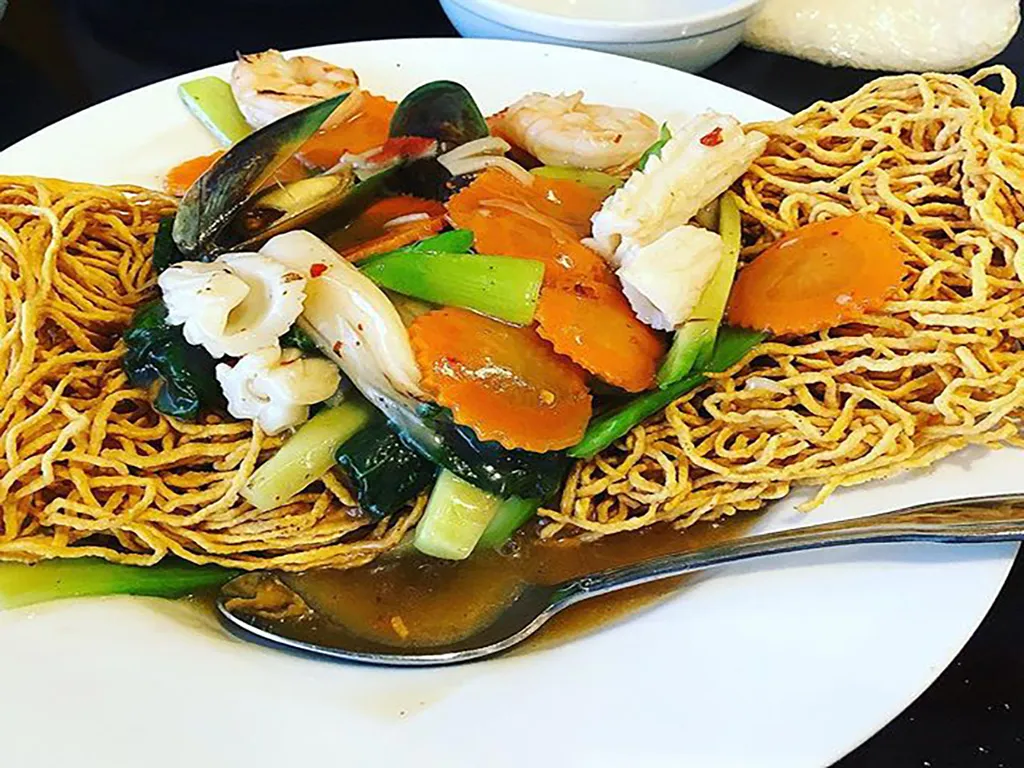 Stir-fried yellow noodles in house-made sauce with mixed veggies, and sesame oil.