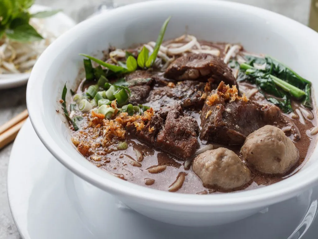 Authentic Thai style rice noodle soup with beef steak, meatball, water spinach, bean sprouts, green onion, cilantro, and fried garlic. Serve with si....