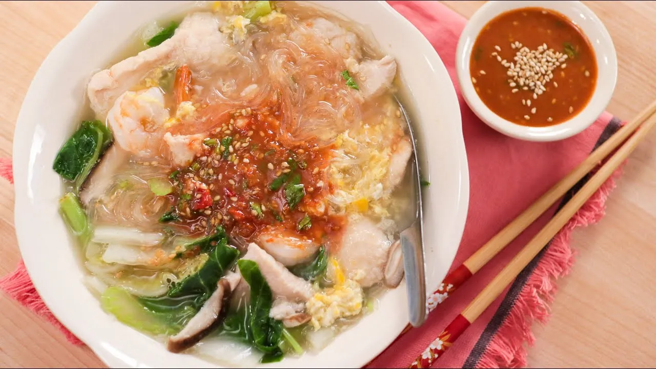 Glass noodle style soup with beef, egg, shrimp, and squid. Top with green onion, cilantro, water spinach, white cabbage, and homemade suki sauce.