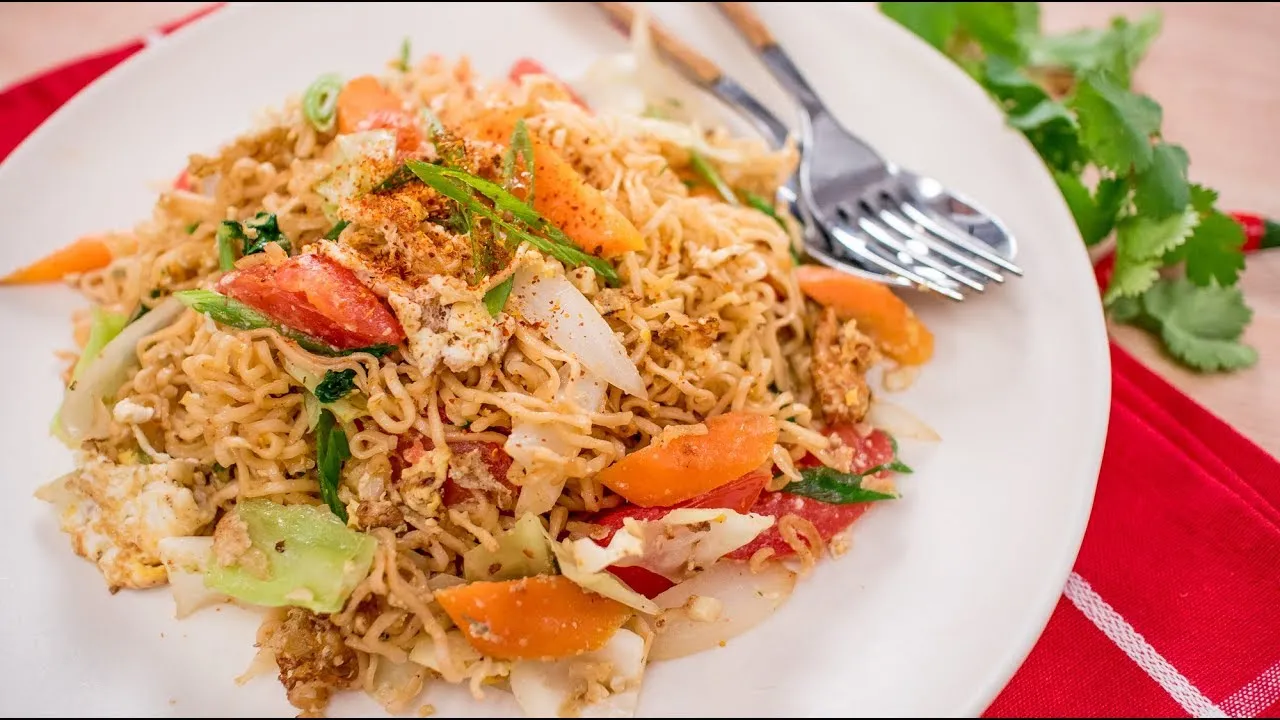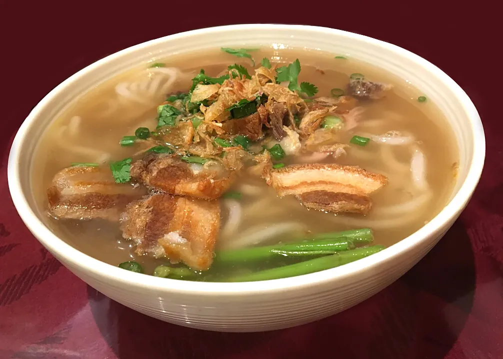 Thin egg noodles with crispy pork belly, shrimp, and quail eggs. Top with green onion, cilantro, and fried garlic. Serve with side veggies.