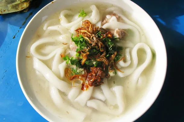 Homemade style soft string noodles with chicken and a choice of adding pork blood. Top with cilantro, green onion, fried garlic. Serve with side veg....