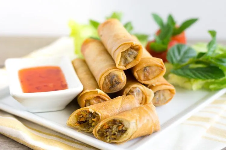 Thai rolls with specially prepared filling (ground pork, clear noodle and carrots). Served with Pho Vieng sweet and sour sauce.