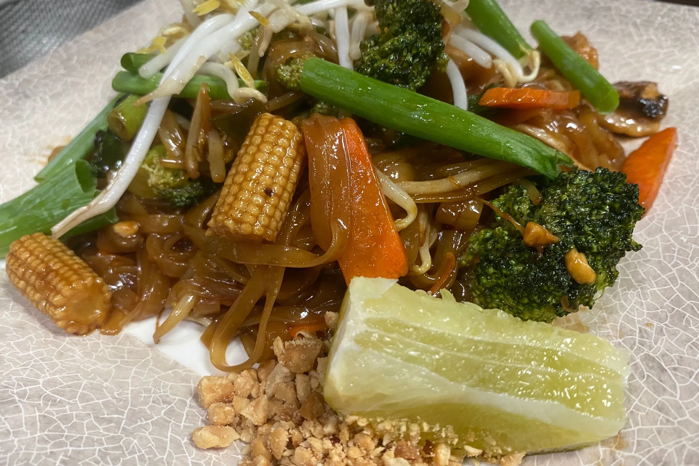 Stir-fried flat rice noodles served with bean sprouts and crushed peanuts, and your choice of Tofu or Mixed Veggies.