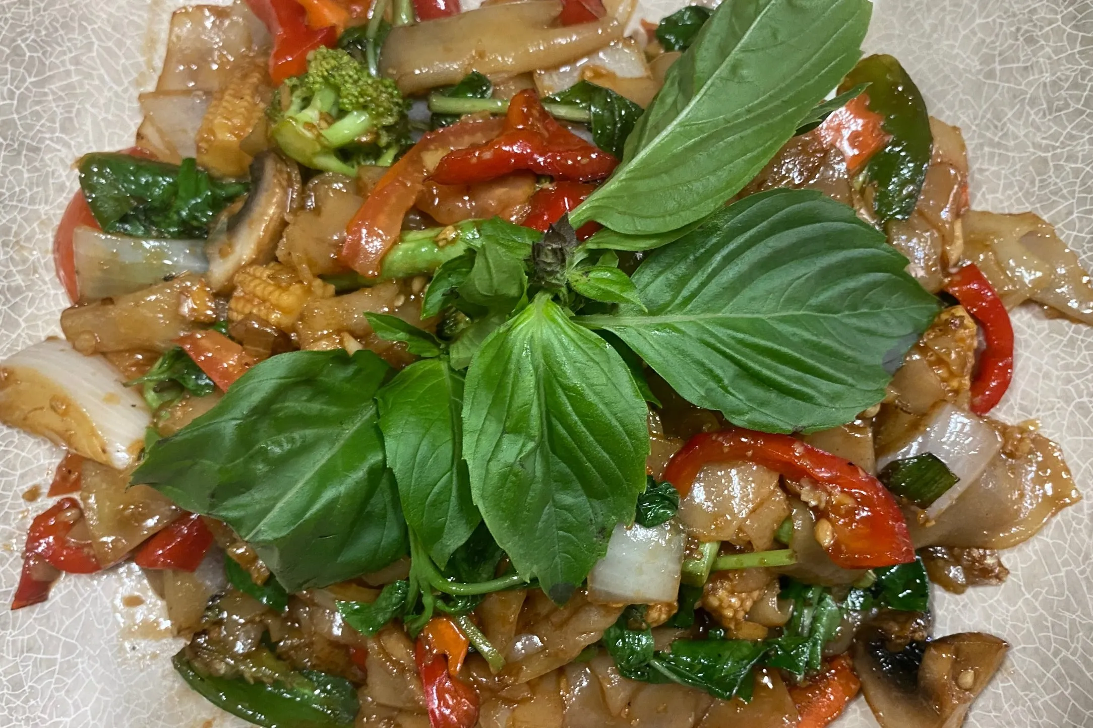 Pan-fried flat rice noodles topped with onions and basil and your choice of Tofu or Mixed Veggies.