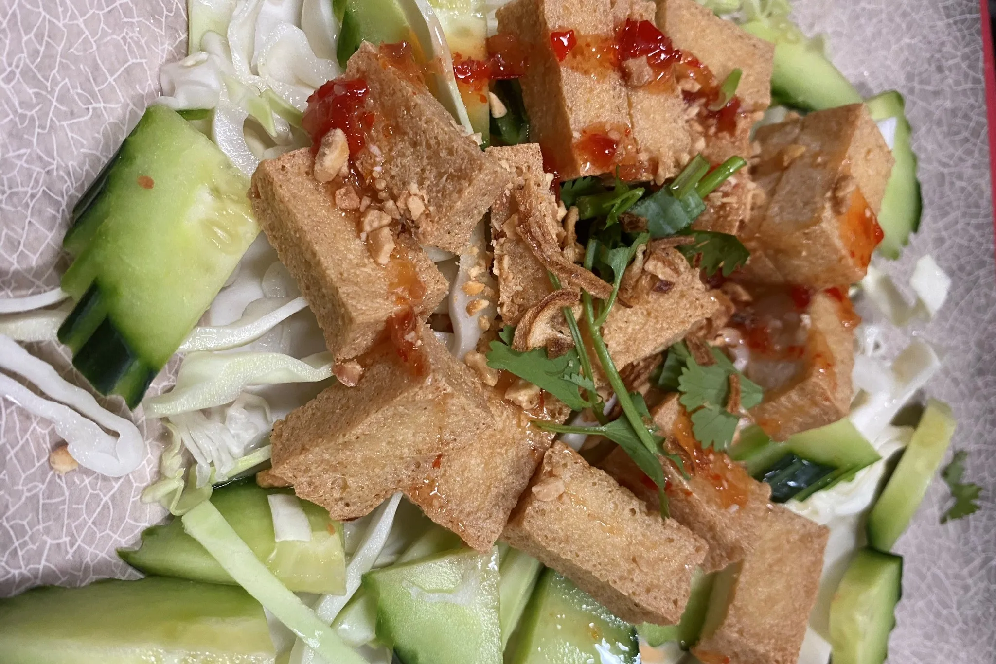Deep-fried tofu over cucumber and cabbage. Glazed with sweet and sour sauce.
