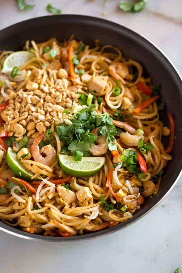 Popular Thai sweet & sour noodles stir-fried with eggs, and your choice of meat. Top with green onions, ground peanut, bean sprouts and side of lim....